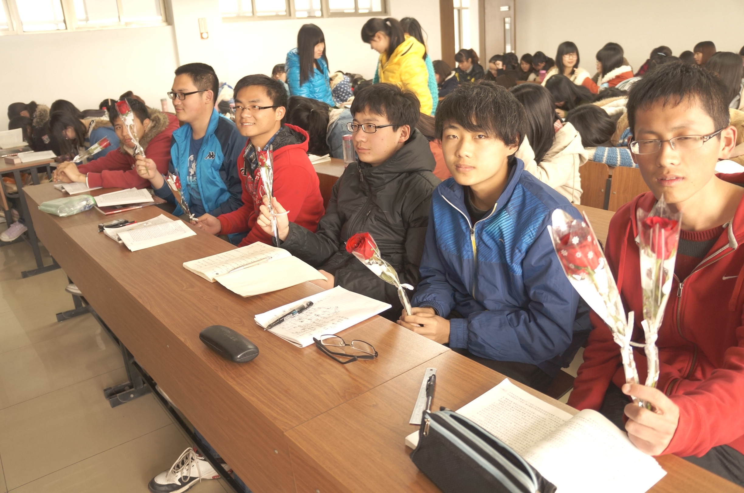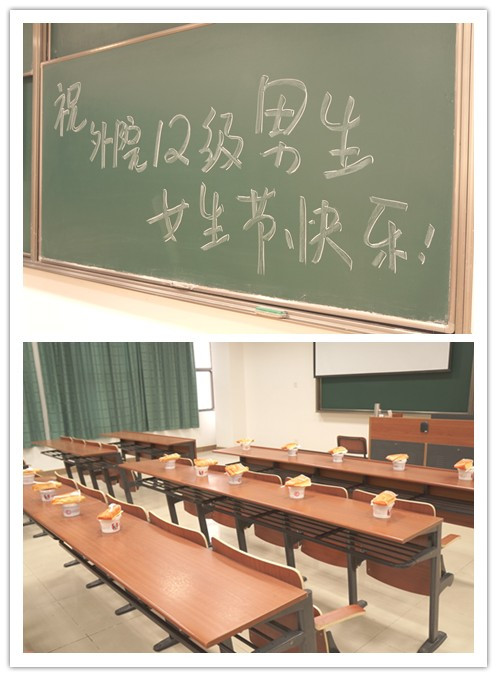 特殊的节日在重重惊喜中度过。早上7点,男生们一走进早读教室,就发现了年级中心组为他们准备的爱心早餐,伴随着黑板上“祝外院12级男生节日快乐”的大字,拉开了节日的序幕。第二轮惊喜是“魅力男生”颁奖环节,各班女生为每位男生送上了一张特制奖状,有的是男生形象漫画,有的印有男生招牌照片,奖项也根据获奖人的性格和平时表现各不相同,包括“最萌帮主奖”、“最稀有奖”、“草莓王子奖”等等,表达着班级女生对男生的美好印象和对他们闪光点的发掘。第三份惊喜礼物是抽取愿望卡,男生根据抽中的卡片可以找班级女生实现一个愿望,比如可指定女生体育课后帮忙送水擦汗,可指定女生帮买午餐并送至宿舍等等,女生表示愿意用自己的行动回馈男生平时对班级同学的关爱。最后一轮惊喜则是玫瑰派送。课间,年级每位男生都收到了一枝鲜艳的玫瑰,再次将节日气氛推向高潮,不少男生都表示是第一次收到玫瑰,显得十分羞涩。