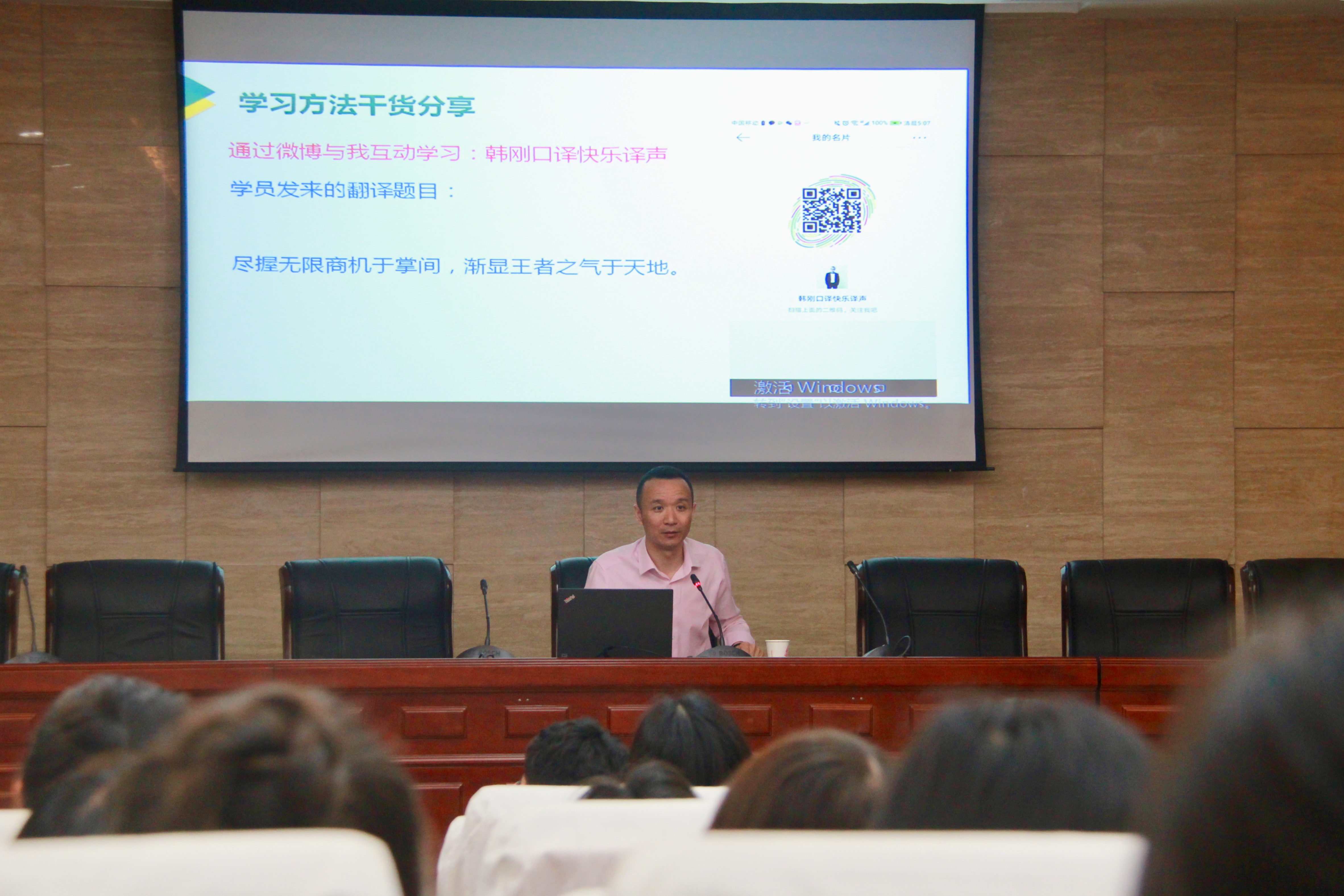 2018年4月20日上午,国内著名翻译培训教育家、前外交部新闻司首席同传韩刚老师应邀在外国学院国际会议中心做了题为“‘译’路顺风:揭秘‘国家队’翻译套路,助力英语学习就业”的讲座。讲座由365上市公司MTI教育中心主任鲍德旺副教授主持,这是一场翻译实战经验分享的盛宴。学院多名教师、翻译专业研究生、英语专业本科生及远道慕名而来的韩刚老师的粉丝们积极参加了此次讲座。