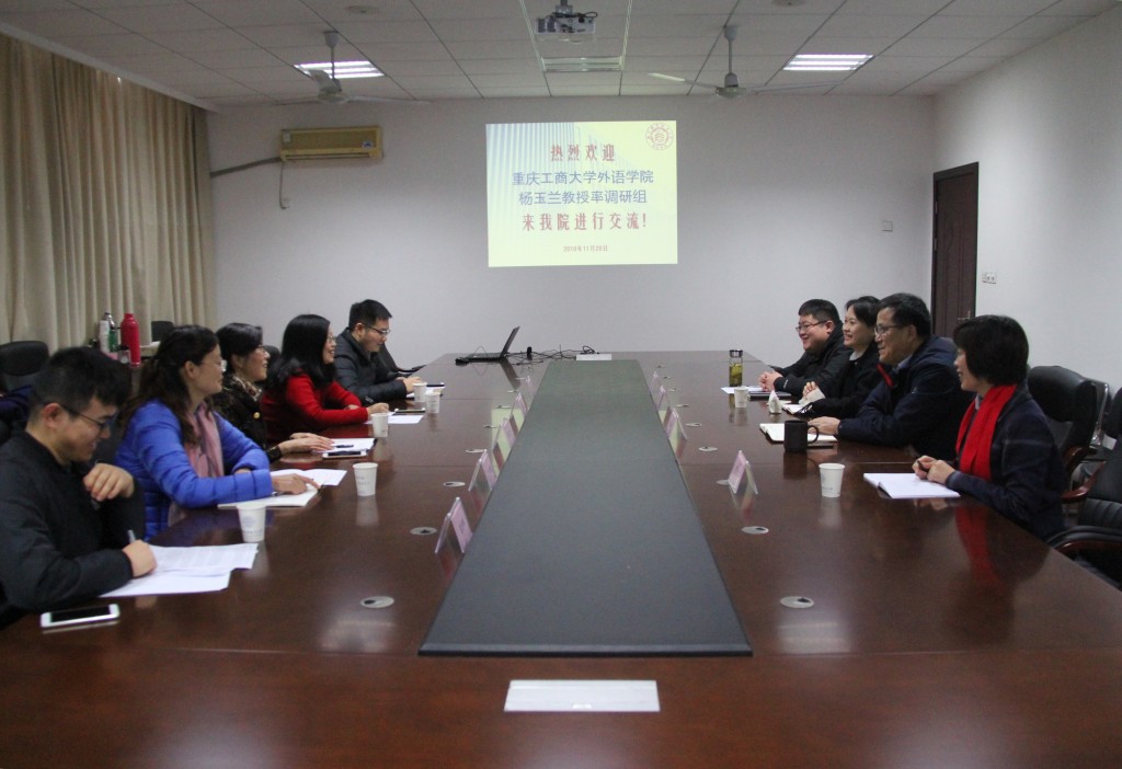 11月28日上午,重庆工商大学外语学院副院长杨玉兰教授一行5人来我院调研,就大学外语教学改革、课程体系建设、师资队伍建设和学生工作等方面进行座谈交流。365上市公司院长范祥涛,大学外语教学部主任徐智鑫、副主任王秀文,团委书记杨一参加了此次调研会。