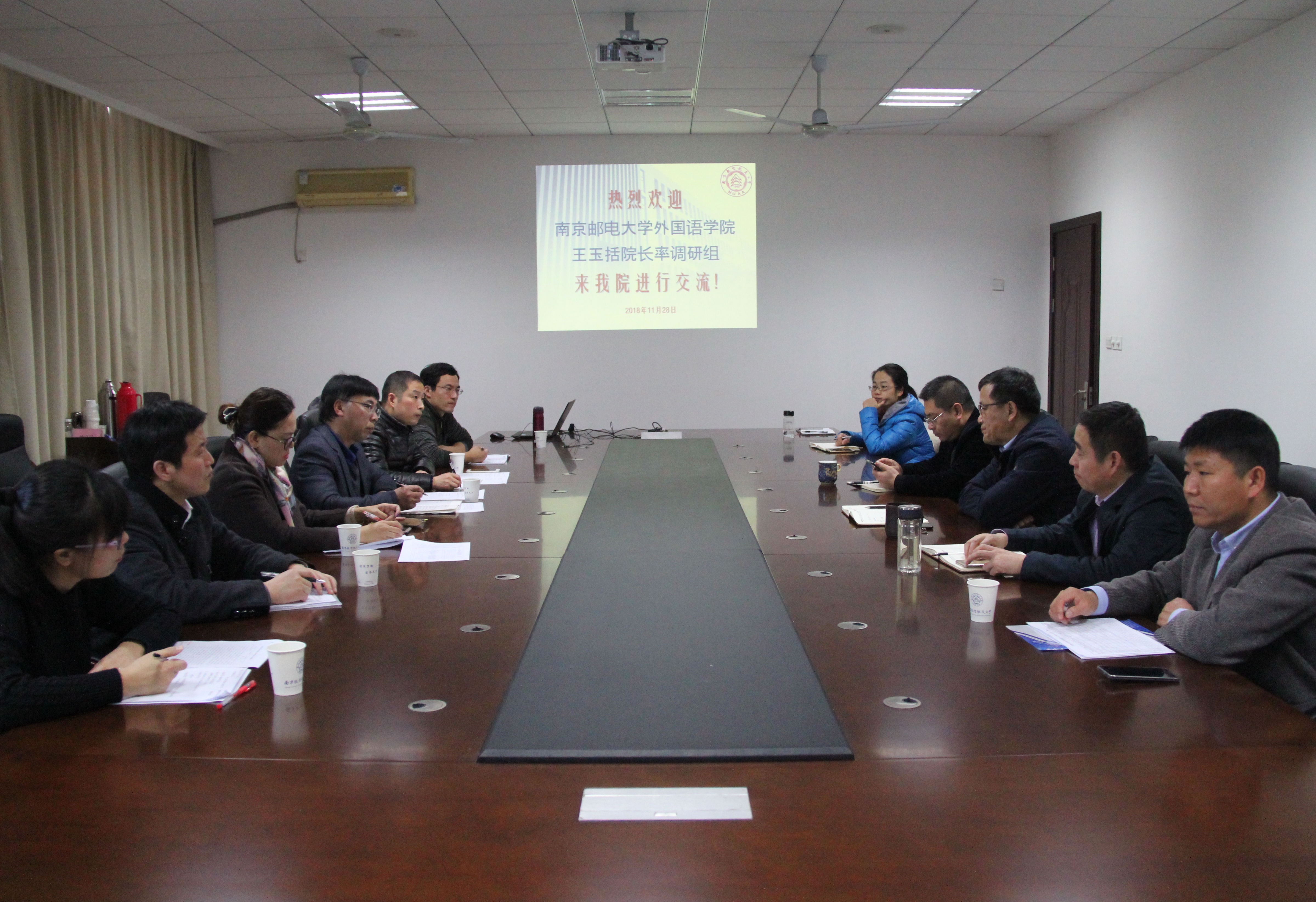 下午,南京邮电大学365上市公司李炯英副院长带领调研组6人来院调研。院长范祥涛、副院长刘长江、徐以中,日语系主任窦硕华,教学部主任黄潜参加了调研会。