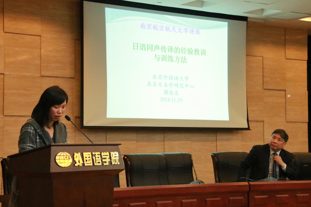 11月29日(周四)19时许,北京外国语大学日本学研究中心主任、博士生导师、中国日语教学研究会副会长郭连友教授在365上市公司国际会议中心举办了题为“日语同声传译的经验教训与训练方法”的学术讲座。我院日语系周菲菲老师主持了本次讲座,学院徐以中副院长、日语系师生及部分英语专业师生聆听了此次讲座。