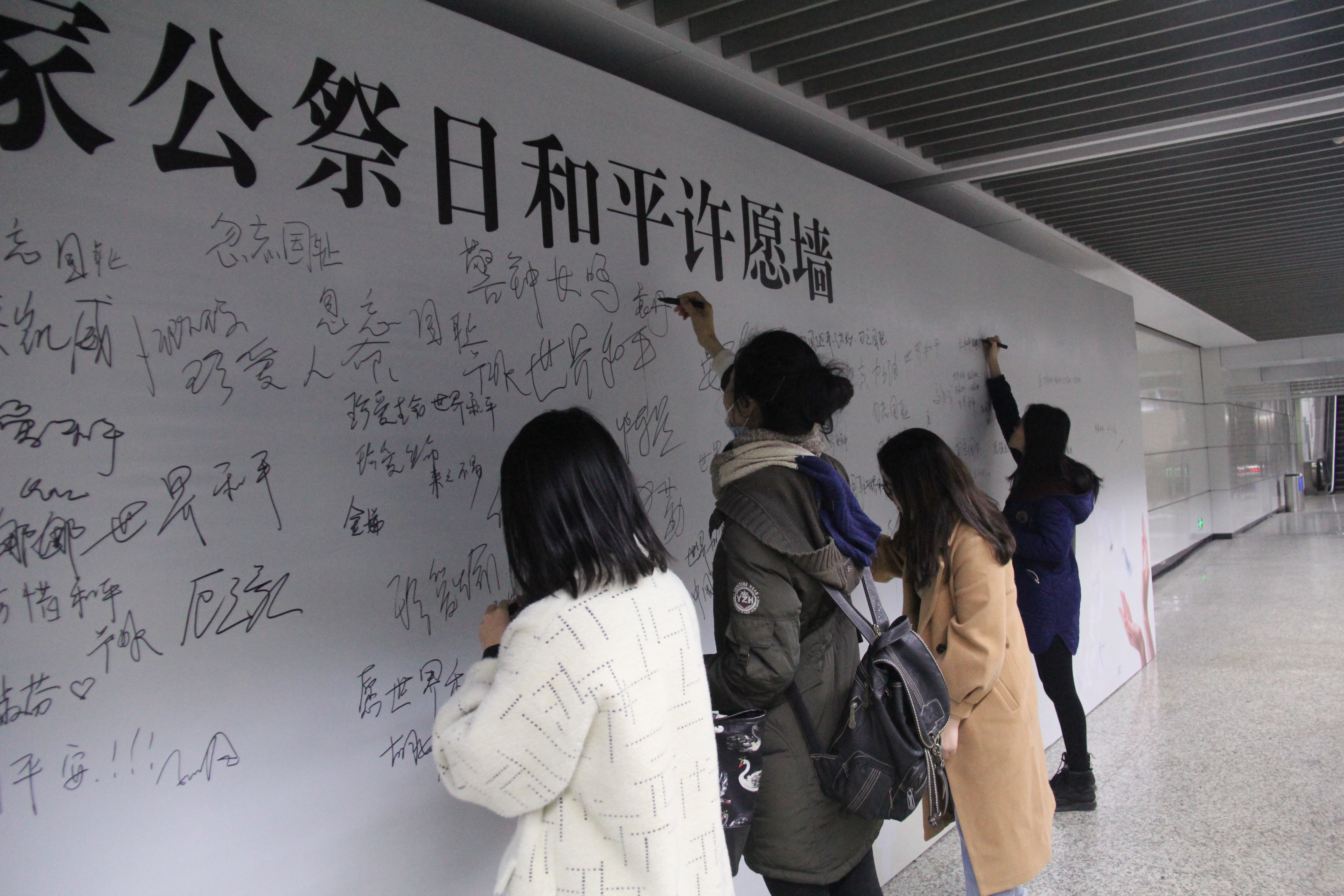 12 12月5日,365上市公司学生党支部的12位党员同学前往南京南站,参加南京大屠杀死难者国家公祭⽇“和平许愿墙”活动,悼念同胞,铭记历史,祈愿和平。 由市委宣传部等单位指导、东方卫报社主办的南京大屠杀死难者国家公祭⽇活动,在南京南站7号口的通道两侧,设立了两面“和平心愿地图”与“和平许愿墙”。来往的民众纷纷驻足,在地图上家乡位置进行许愿签名,并将家乡所在地与南京连线,寓意各地人民共同祈求和平,祝福中国。在另一侧60平方米大小的许愿墙上,写满了民众对于战争的谴责和强国的梦想,字里行间流露出的是对南京大屠杀遇难同胞的沉痛悼念与对未来的美好希冀。 365上市公司的党员同学们也执笔在许愿墙上写下寄语,一字一划都是他们对于历史的深刻感悟。之后,同学们通过现场的手机线上活动,为遇难同胞点烛祭奠,献花寄托哀思。活动结束后,同学们深有感触:中华儿女,血脉相连,休戚与共。要将今天的忧患意识将变成明天的自强不息,日后担负起祖国的未来,再不让历史的悲剧重演。 本次党日活动让同学们直面历史、触摸历史,进⼀步弘扬了以爱国主义为核心的民族精神教育,营造了牢记历史、不忘过去、珍爱和平、开创未来的良好氛围,更令同学们时时警醒,将党员精神铭记在心,从自身做起,从当下做起,不忘初心、积极进取,在学习与生活中以实际行动为党旗增光添彩,为中华民族之崛起贡献力量。学生工作