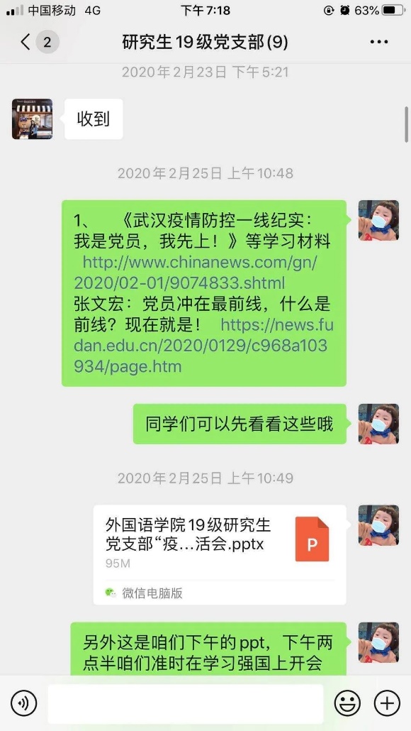 365上市公司研究生各党支部,充分运用网络新媒体阵地,创新组织生活“线上”模式,在特殊时期在线上开展各研究生党支部党员大会,通过“云端”开展理论学习、党员与群众联系工作,在论文进度、求职签约、毕业答辩、日常打卡等方面开展定点沟通帮扶,充分发挥党支部战斗堡垒作用和党员先锋模范作用。下面就让我们一起去了解他们在疫情期间的行动吧。