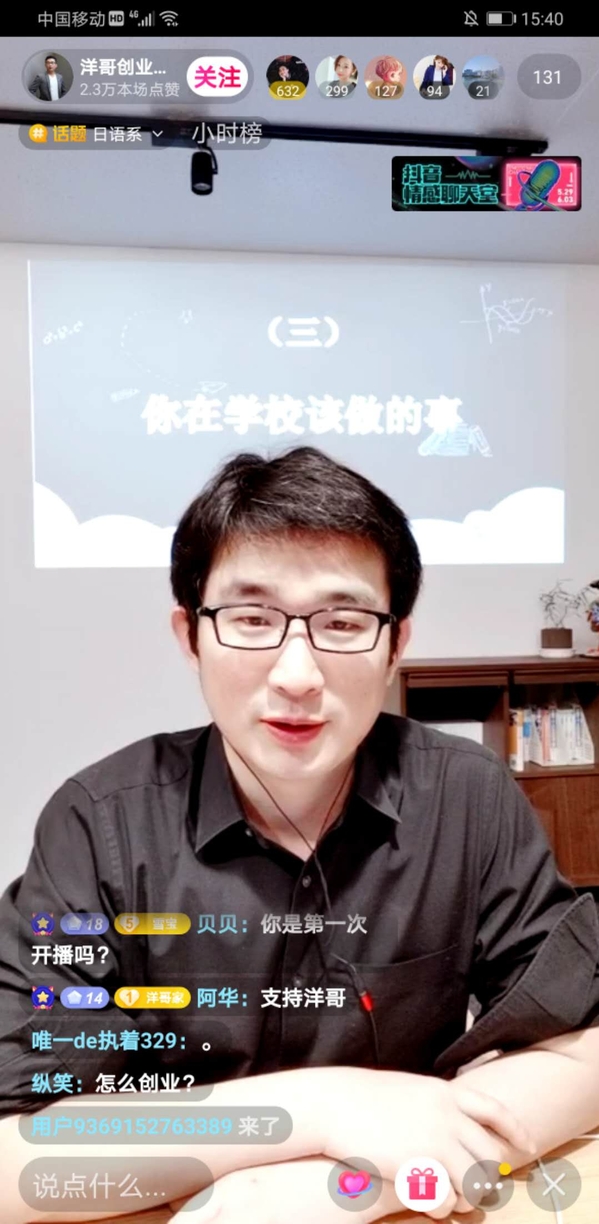 5月31日下午,日语系精品企业课程《科技文化创新创想》第三讲通过抖音平台开启,主讲人为日语系03级刘洋学长,现为谷町君CEO,同时也是南航365上市公司繁星・谷町君奖学金资助者。