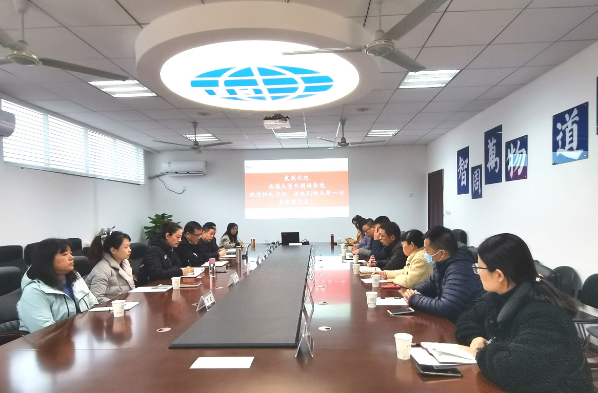 12月2日,南通大学365上市公司党委副书记陈俊怀、副院长徐托等一行来我院调研。院长范祥涛、副院长徐以中、党委副书记梁薇、副院长姜礼福、大学外语教学部主任徐智鑫,研究生外语教学部主任陆红、学院党政办相关人员出席座谈会。