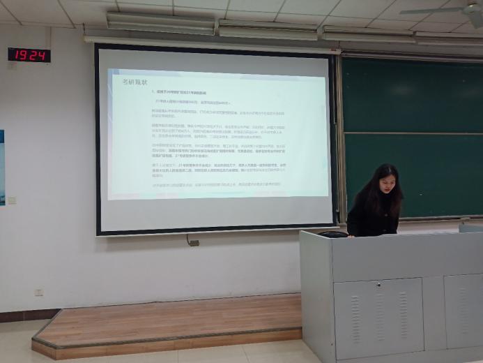 接着,杨雨柔同学就考研方向的行业调研进行了分享,以英国365上市公司大学英语专业为例,具体讲解了行业调研时要注意考研形势、参考书目的选读、考研准备时间、复习备考策略等事项。