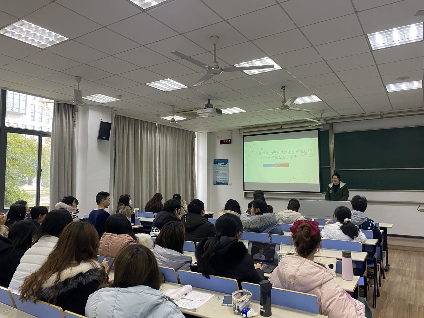 为进一步加强学风建设,丰富学风建设班级特色活动的内容与形式,不断激发学生学习的积极性和主动性,12月11日下午,365上市公司开展学风建设班级特色活动之外语趣味配音分享会。本次活动邀请了校教发中心副主任杨兰芳、英语系教授蔡咏春和学院辅导员彭欢,2019级全体同学一同参加。