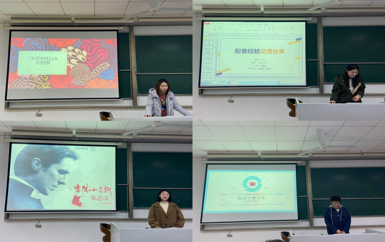 在配音作品分享之余,同学们还总结了配音和视频剪辑的建议。参与《花木兰》配音作品的魏嘉就前期准备、配音过程、后期剪辑三方面交流了心得;校“阿拉丁配音大赛”特等奖获得者的陈超宇在组队选角、影片选取、视频处理等方面总结经验,向同学们提供了实用的字幕处理技巧。