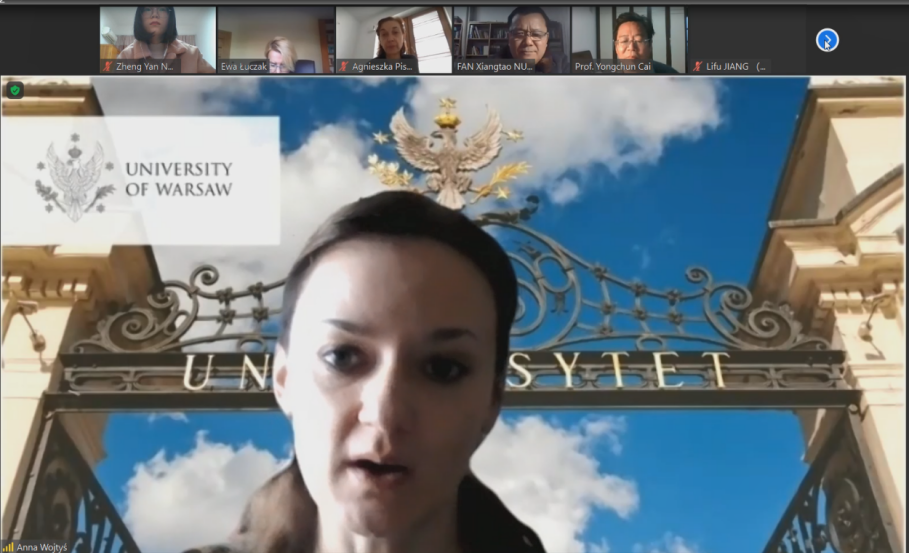 1月28日下午,我院与波兰华沙大学(University of Warsaw)现代语言学院顺利召开国际合作线上会议。波兰华沙大学现代语言学院副院长Anna Wojtys、英语研究系主任Agnieszka Piskorska、Ewa Barbara Luczak,我院院长范祥涛、副院长徐以中、副院长姜礼福、英语系主任张立新、学院对外联络中心主任赵富春、英语系教授蔡咏春等8位教师出席了会议。会议由我院刘世红副教授主持。