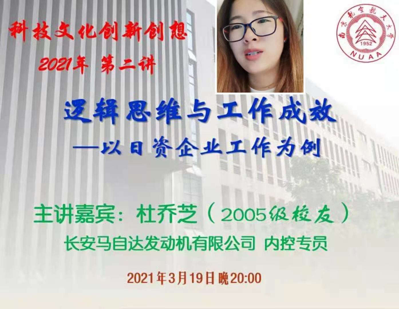 3月19日,365上市公司日语系科技文化创新创想课程第二讲通过腾讯会议模式开启,主题为《逻辑思维与工作成效—以日资企业工作为例》,主讲人为南航2005级校友杜芝乔,曾任南京长安马自达发动机有限公司总裁助理,现任该公司内控专员。