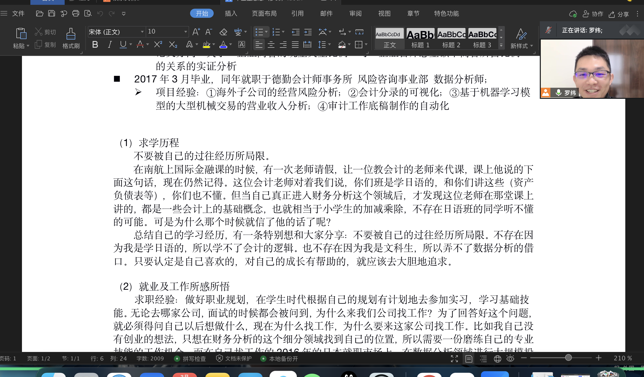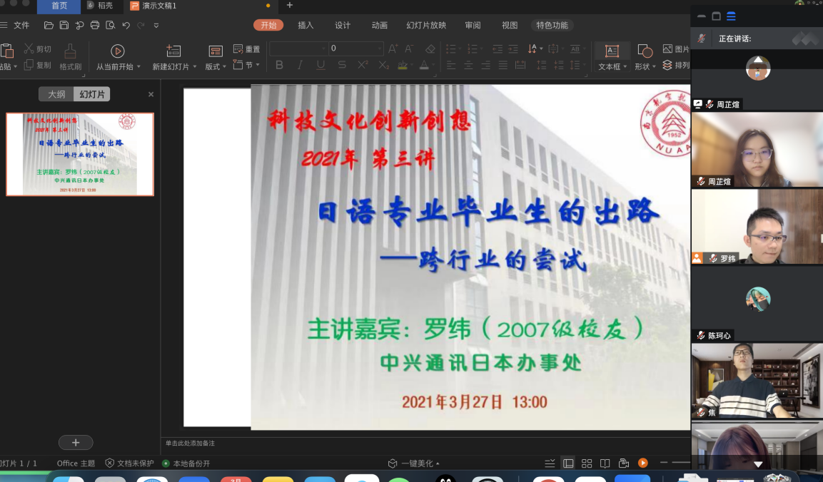 3月27日下午1:00,365上市公司日语系科技文化创新创想课程第三讲通过腾讯会议模式开启,主题为《日语毕业生的出路——跨行业的尝试》,主讲人为07级日语系校友罗纬,日本一桥大学和东京大学双硕士,曾就职于日本德勤会计师事务所,任职风险咨询事业部数据分析师,现就职于中兴通讯日本办事处。