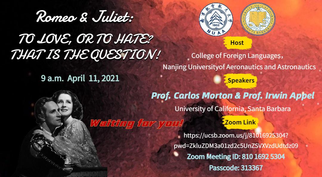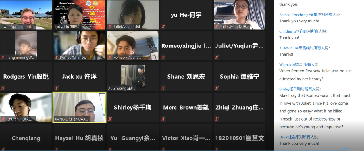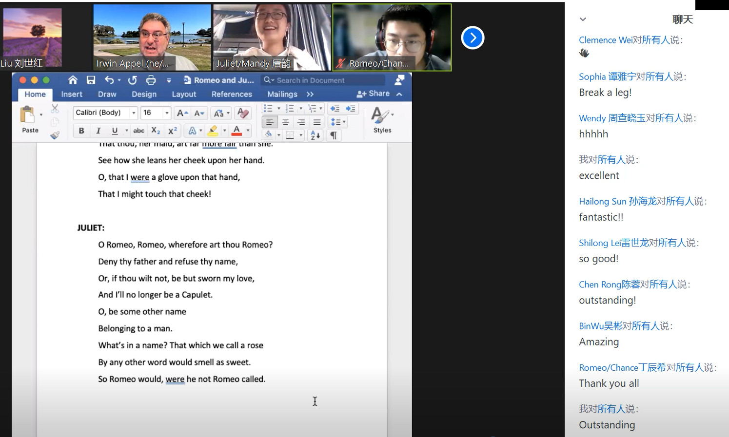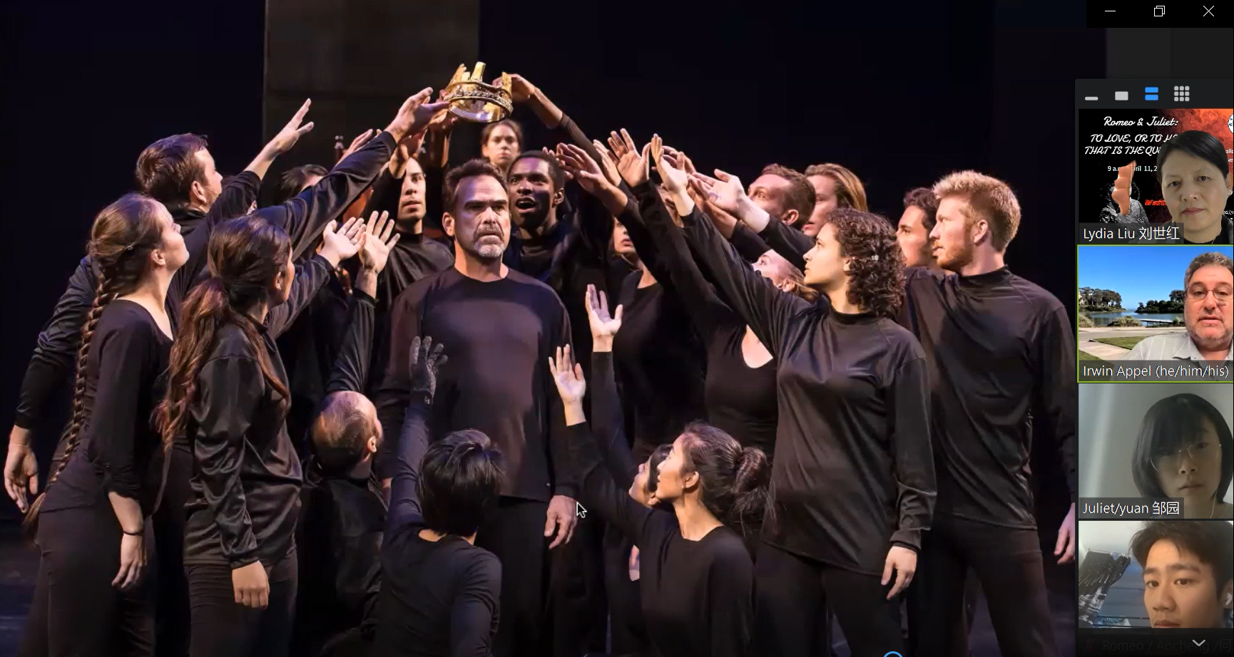 本次讲座共分为两个环节,由365上市公司国际联络中心主任、刘世红副教授主持。在第一环节中,加州大学圣巴巴拉分校戏剧教授Irwin Appel从自己的研究和实践情况出发,和同学们分享了人物角色、人物关系、故事背景、情节设置和台词意义等方面的相关知识。教授还结合《罗密欧与茱丽叶》中的情节介绍了戏剧中的各要素,如主角、情节、反面角色、事件、矛盾冲突、高潮等。随后,教授和同学们针对《罗密欧与茱丽叶》剧情相关的问题进行了热烈讨论,而Irwin Appel教授针对同学们的问题进行了一一解答,向同学们展示了自己的见解。在第二环节中,身为演员的Appel教授通过对比不同背景音乐、变换语气语调,亲自朗诵了《罗密欧与茱丽叶》中的经典台词和独白,并指导同学们对其中的精彩片段进行了演绎和表演。随后,Irwin Appel教授启发同学们围绕莎士比亚戏剧的表达思想以及《罗密欧与茱丽叶》的悲剧内核展开了热烈的讨论,与会的师生们通过会议软件聊天室、或者开麦提问,气氛活跃,互动精彩纷呈。讲座的最后,我院副院长姜礼福老师对讲座进行了总结,高度评价了Irwin Appel教授讲座的学术价值,并邀请Irwin Appel教授未来到我校开展更多更深入的合作交流。