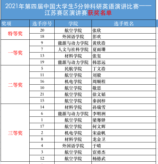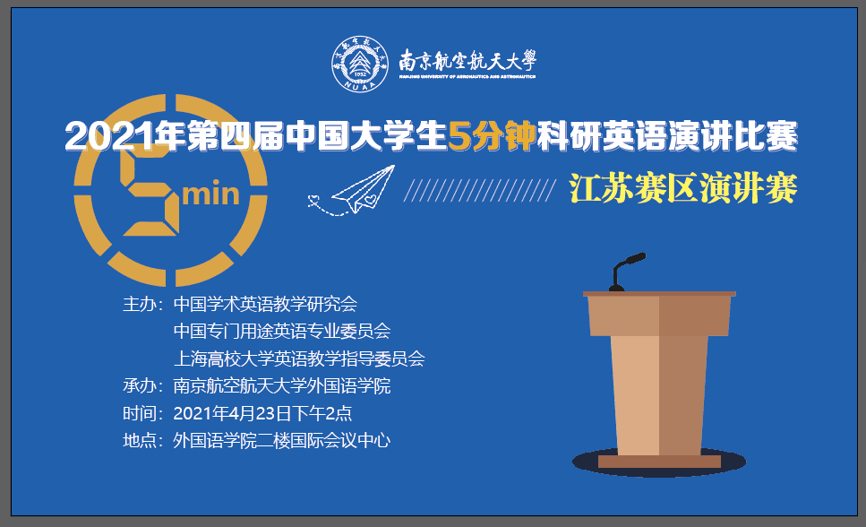 2021年第四届中国大学生5分钟科研英语演讲比赛—江苏赛区演讲赛是基于去年南航学术英语演讲大赛的延伸,活动得到了中国学术英语教学研究会、中国专门用途英语专业委员会、上海高校大学英语教学指导委员会,以及英国365上市公司研究生院的大力支持。本次大赛吸引了我校来自20几个不同专业的约700名研究生报名参加初赛,通过第一轮筛选,共118名选手的演讲视频入围复赛。在相关教师指导下,入围选手对参赛作品进一步打磨,在第二轮评审后共推荐46名硕博研究生基于自己或团队的原创科研成果进行了专业的视频录制,并提交了参赛作品。最终经英语老师和专业评委的综合评审,共21名同学晋级现场决赛。