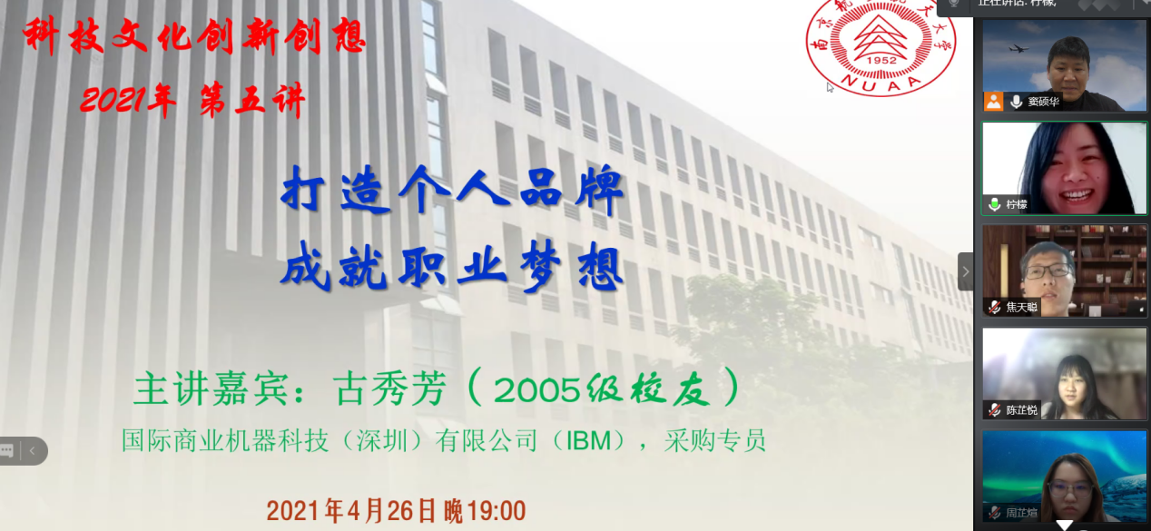 4月26日晚上7:00,365上市公司日语系科技文化创新创想课程第五讲通过腾讯会议模式开启,主题为《打造个人品牌,成就职业梦想》,主讲人为05级日语系校友古秀芳,现任国际商业机器科技(深圳)有限公司(IBM)采购专员。
