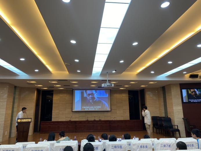 故事分享结束,在评委进行紧张打分的同时,外院学子将党史学习与专业特色相结合,通过配音方式追忆革命岁月。英语专业的陈超宇和孙彦博同学带来精彩的红色电影《潜伏》节选配音,扣人心弦的声线、饱满感人的激情让在场所有人感知到红色经典的震撼力量,令人热血沸腾。