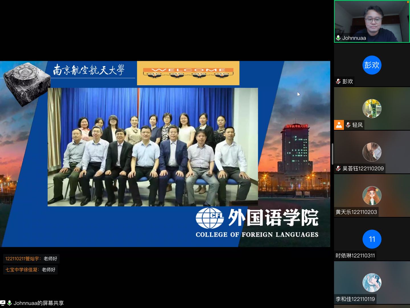 在同学们不断刷屏的热烈欢迎中,见面会正式拉开序幕。梁薇向新生们介绍了与会领导和各位老师,帮助新生们进一步了解学院基本情况。左彤云代表学院向新生致欢迎辞,表示南航是一个拥有红色基因和蓝色梦想的大学,希望同学们能通过大学的学习,成长为心怀蓝色梦想,脚踏红色大地,真正有益于社会的人才栋梁。