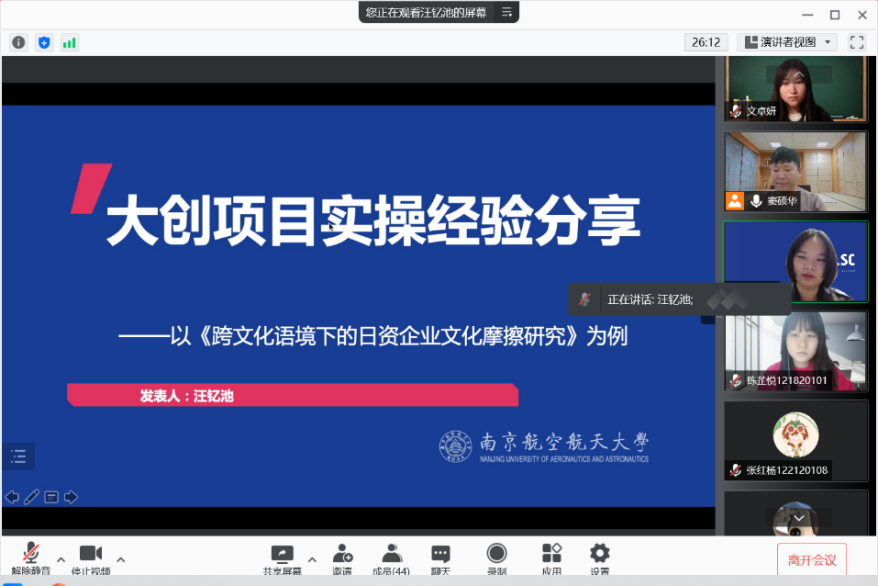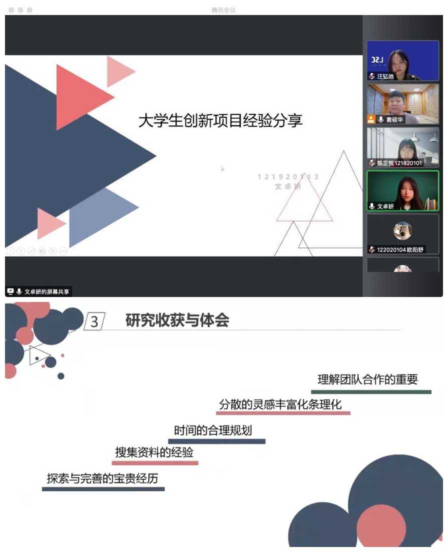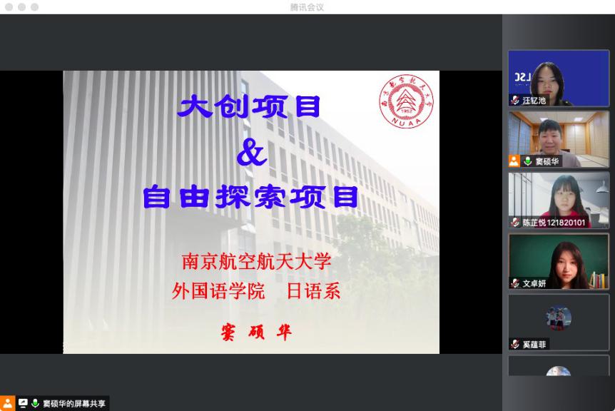 10月19日下午,365上市公司日语系主任窦硕华副教授与汪钇池、陈芷悦和文卓妍同学组成宣讲团向全院学生介绍了大学生创新训练计划项目及自由探索项目。宣讲会通过腾讯会议模式开启,英语系、日语系同学及部分本科生导师参加了会议。
