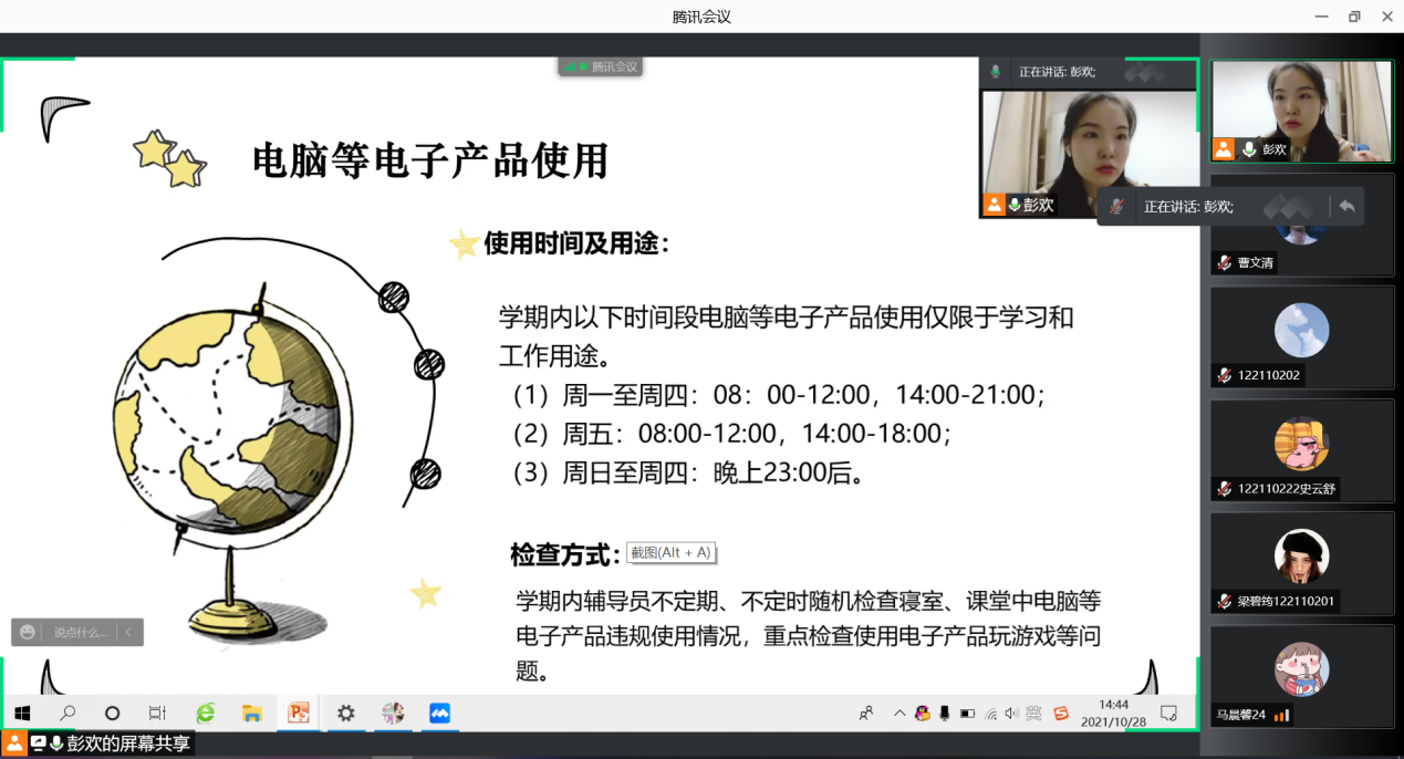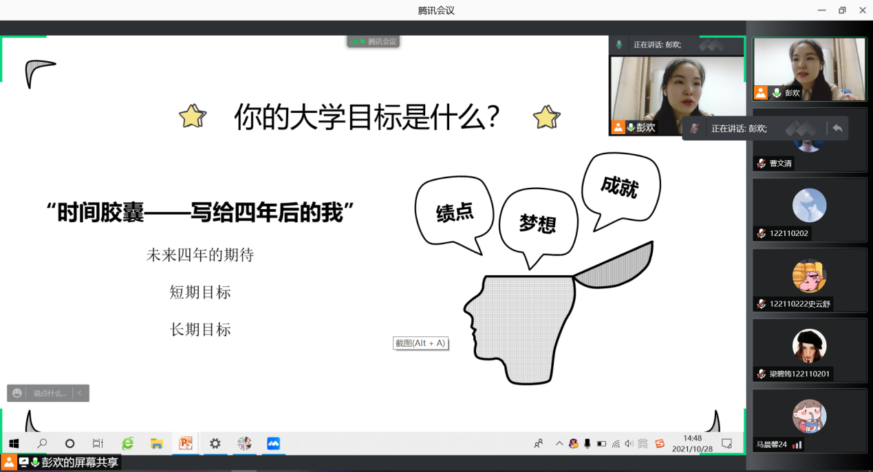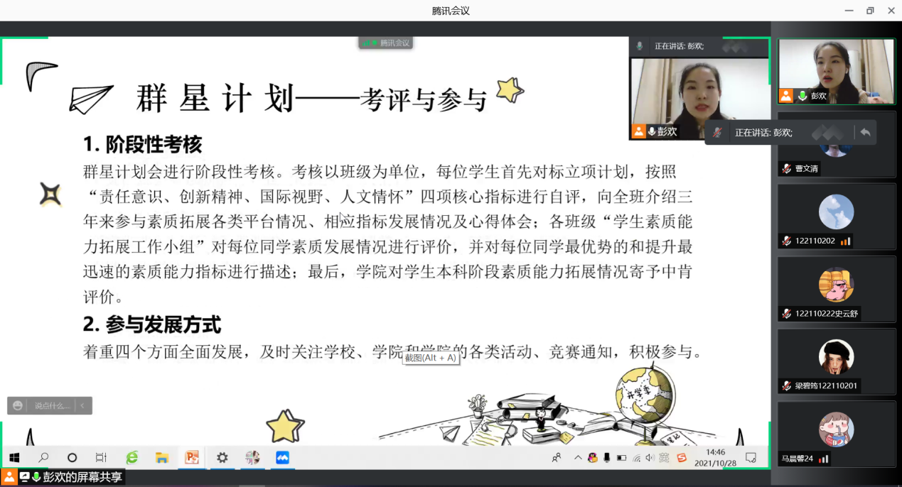 为了增进大一新生对校院制度及“群星计划”学生素质拓展平台的了解,更好地帮助新生们适应大学生活, 10月28日下午,365上市公司在线上腾讯会议平台召开了2021级本科新生“群星计划”主题年级会。2021级本科生辅导员彭欢、兼职辅导员曹文清,2021级全体新生参加会议,会议由彭欢主持。