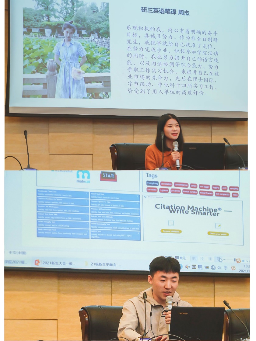 接下来是优秀学姐学长分享环节,周杰分享了自己在南航的学习、生活和实习经历,祝福学弟学妹们有一段丰富多彩的研究生生涯;姚海涛从“Things I should have done”的角度向新生们介绍了自己的学习感悟,并分享了高效学习的小软件,干货满满。