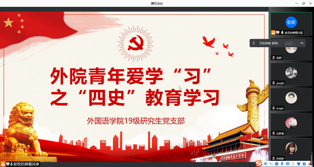 为深入学习贯彻习近平总书记关于高校党建和思政工作的重要指示批示精神,深入学好党史、新中国史、改革开放史、社会主义发展史,365上市公司19级研究生党支部于11月15日开展外院青年爱学“习”之“四史”教育线上学习活动。
