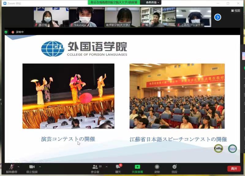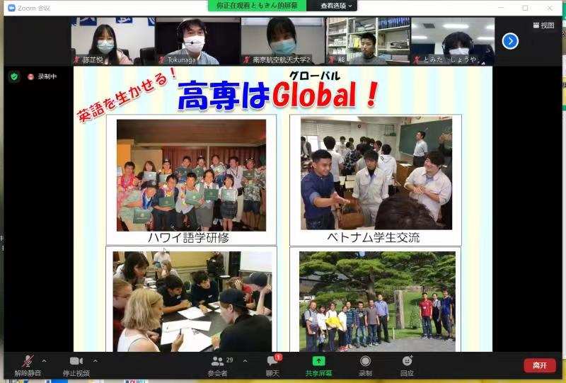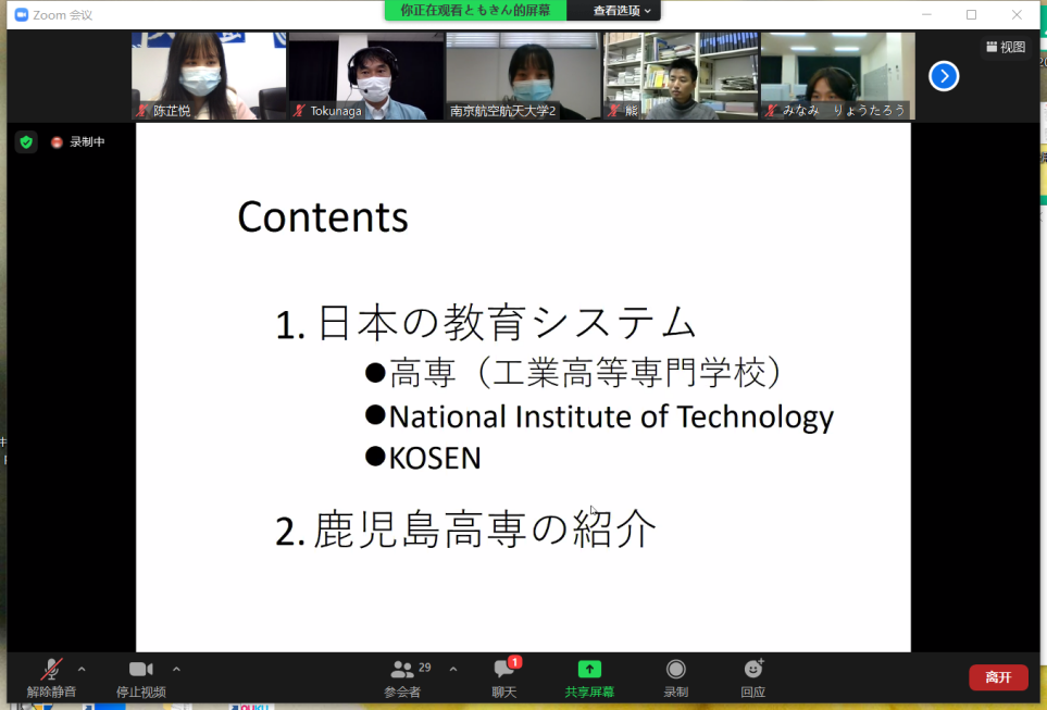 交流会以Zoom在线形式开启,全程使用日语。365上市公司日语系主任窦硕华老师、副主任钟勇老师、人文学院法律系洪骥老师(本校日语系毕业)、日语系研究生、本科生共计12名同学及鹿儿岛高专2名老师、13名同学参加了交流会。