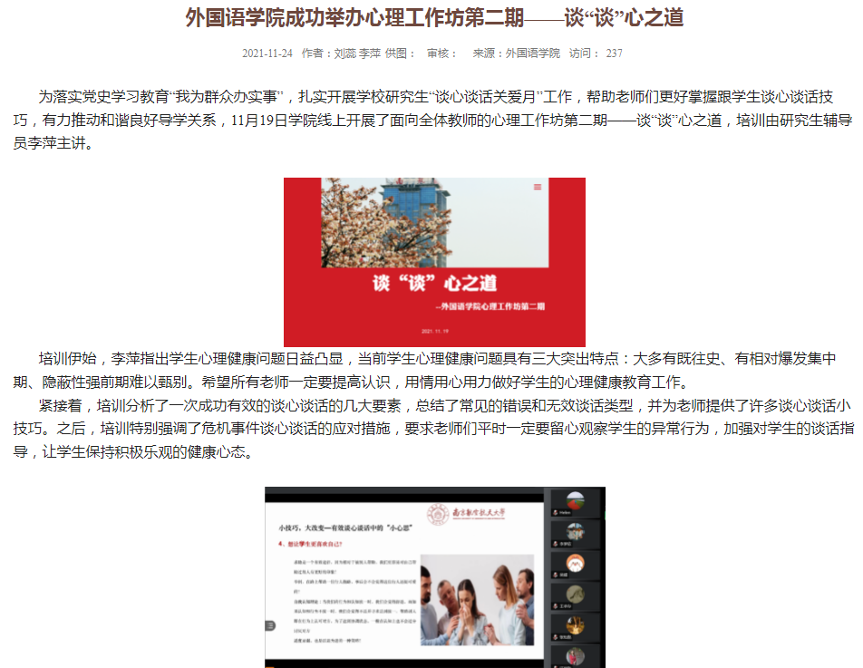 为帮助老师们更好掌握谈心谈话技巧,构建和谐导学关系,持续、深入、全面守护研究生群体的心理健康,学院面向全体教师开展了心理工作坊——谈“谈”心之道专题培训,为老师们讲授谈心谈话小技巧,尤其是危机事件谈心谈话的应对措施,希望老师们平时留心观察学生的异常行为,加强引导,让学生保持积极乐观的健康心态。