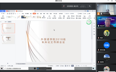 根据教务处统一部署,12月3日中午,365上市公司举办了2018级本科论文导师线上培训会议。英语系主任张立新教授主持会议,院长范祥涛教授、副院长徐以中教授、姜礼福副教授、学院督导组长谢小苑教授及教学办老师、英日语专业论文指导教师参加了会议。
