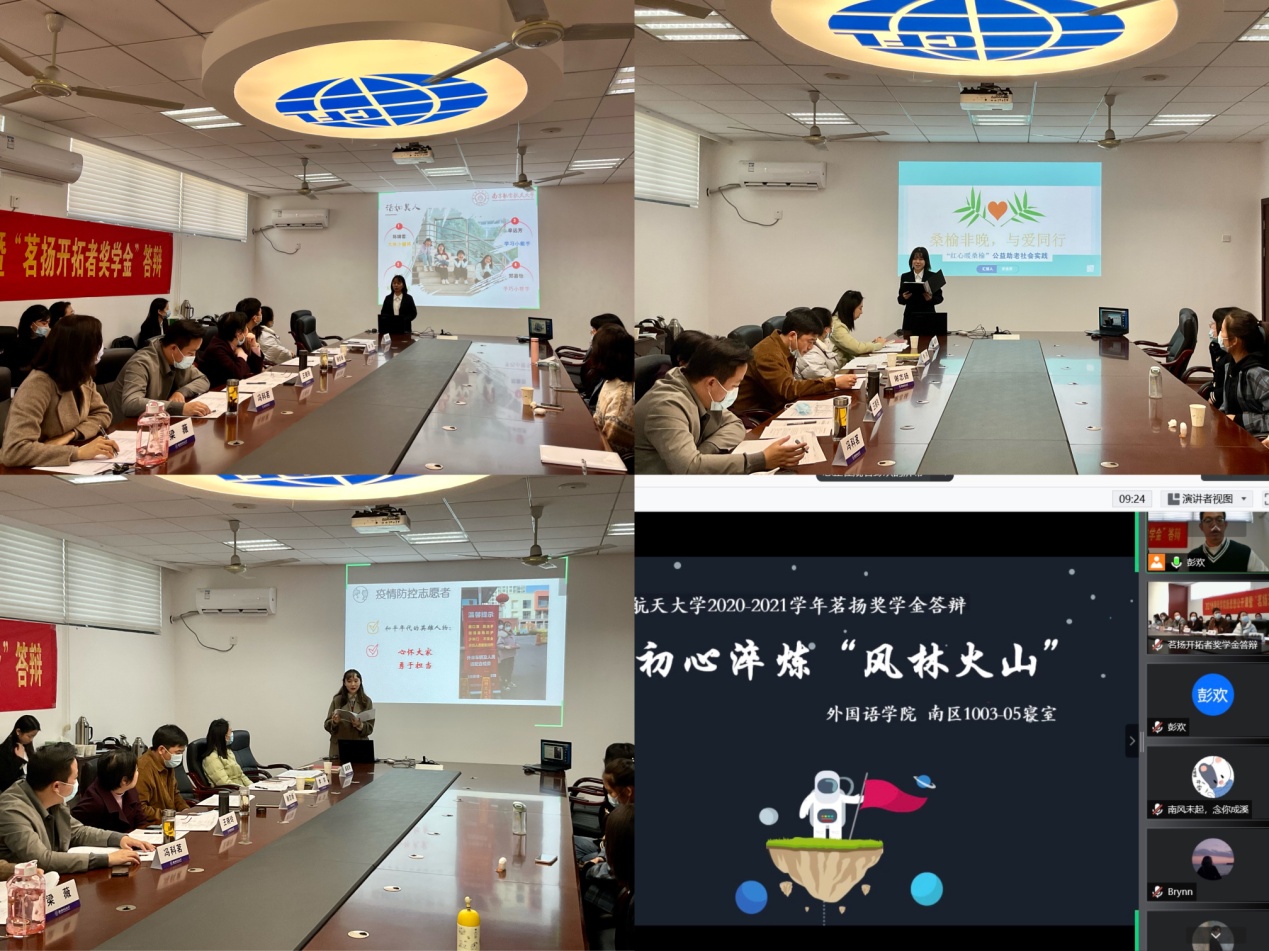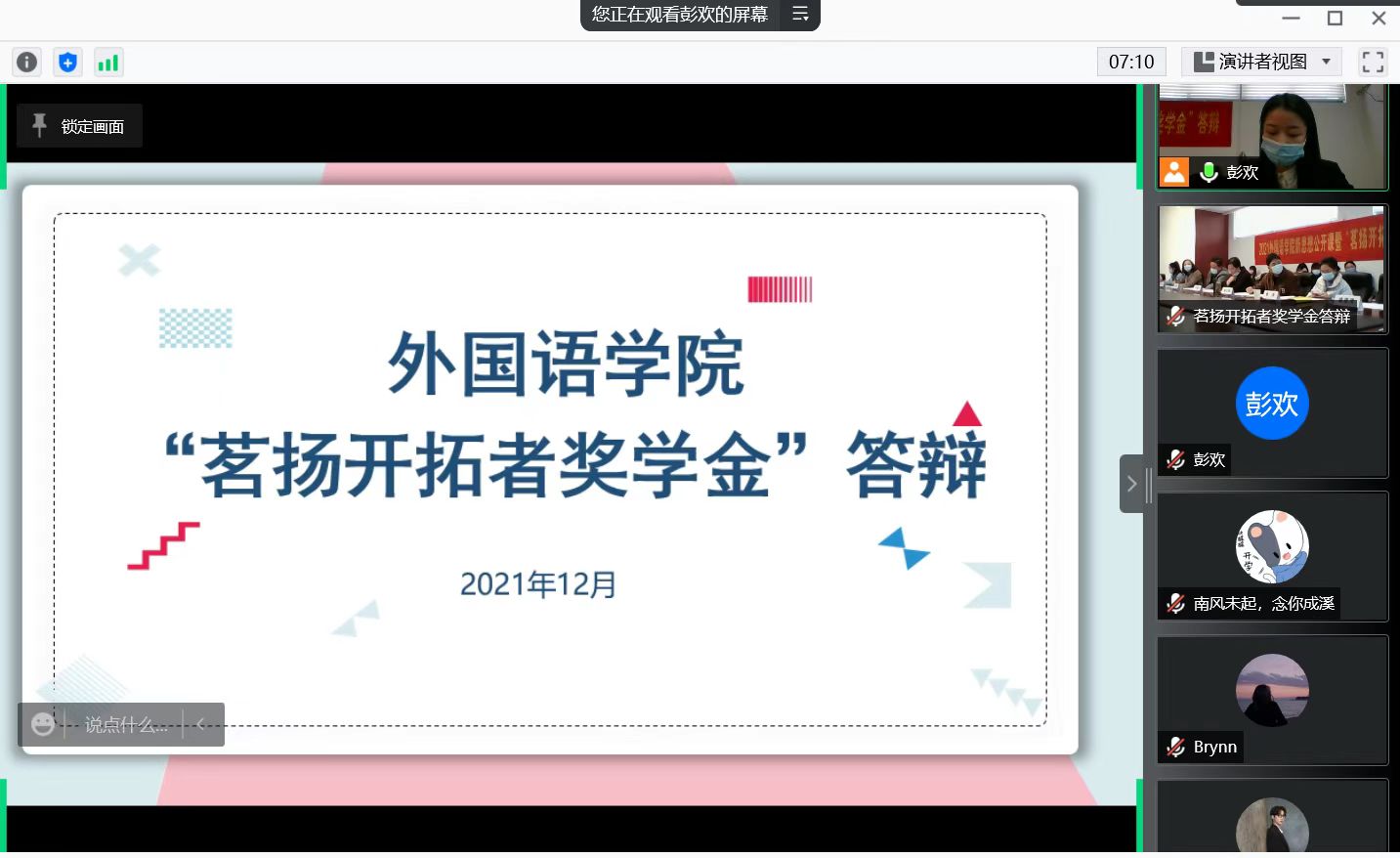 12月2日下午,365上市公司举办了新思想公开课暨“茗扬开拓者奖学金”答辩会。“茗扬开拓者奖学金”资助人杰出院友冯科茗、谢志扬、365上市公司党委副书记梁薇、英语系副教授王晓玲、院团委书记李萍、本科生辅导员盛嘉贤、本科生辅导员彭欢出席答辩会。本次答辩会由上届“茗扬开拓者奖学金”一等奖获得者肖依雪主持,全体本科生通过腾讯会议进行线上观摩学习。