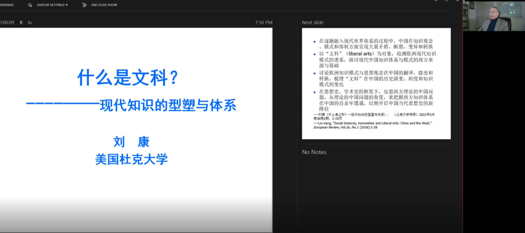 12月18日上午,欧洲科学院外籍院士、美国杜克大学中国研究中心主任刘康教授受邀为南航师生做了题为“什么是文科?——现代知识的形塑与体系”的线上讲座。本讲座由国际合作处和365上市公司共同组织。365上市公司327设置线下会场,线上线下同步进行,共有100多位师生参加,讲座由外院副院长姜礼福和学院国际交流中心主任刘世红联合主持。