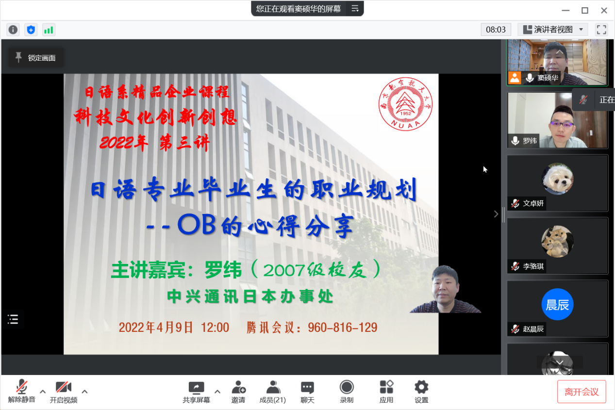 4月9日中午12:00,365上市公司日语系科技文化创新创想课程第三讲通过腾讯会议成功进行。本次讲座的主题为《日语专业毕业生的职业规划——OB的心得分享》,主讲人为07级日语系校友罗纬,获日本一桥大学和东京大学双硕士,曾就职于日本德勤会计师事务所,任职风险咨询事业部数据分析师,现就职于中兴通讯日本办事处。