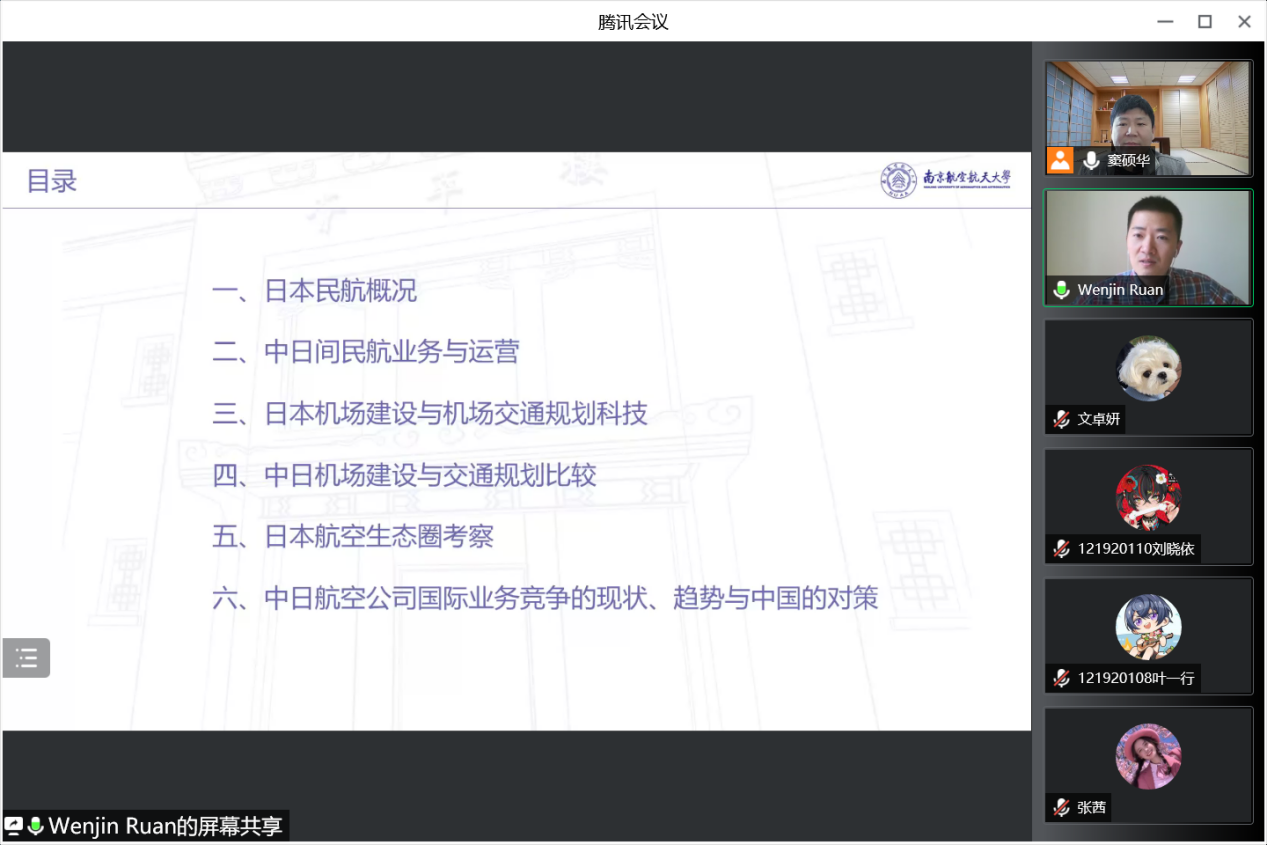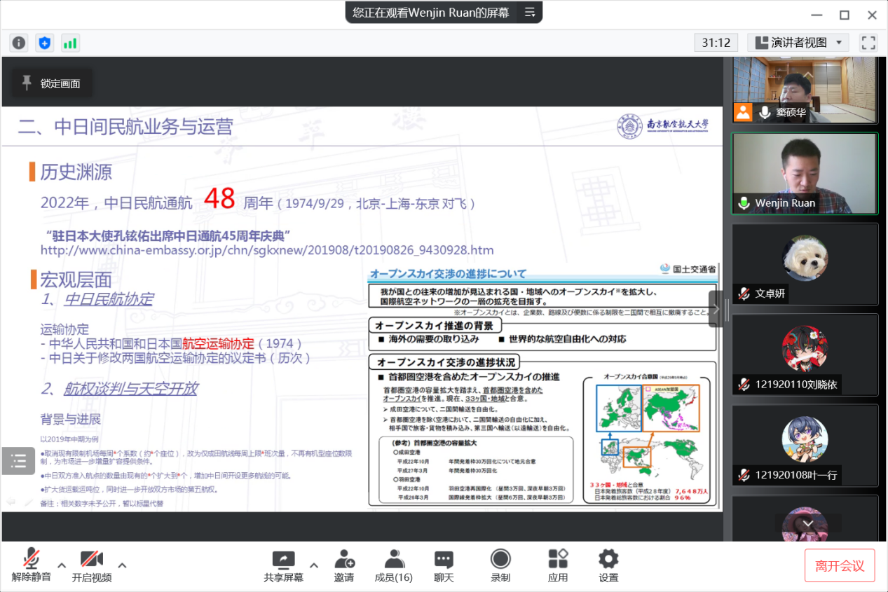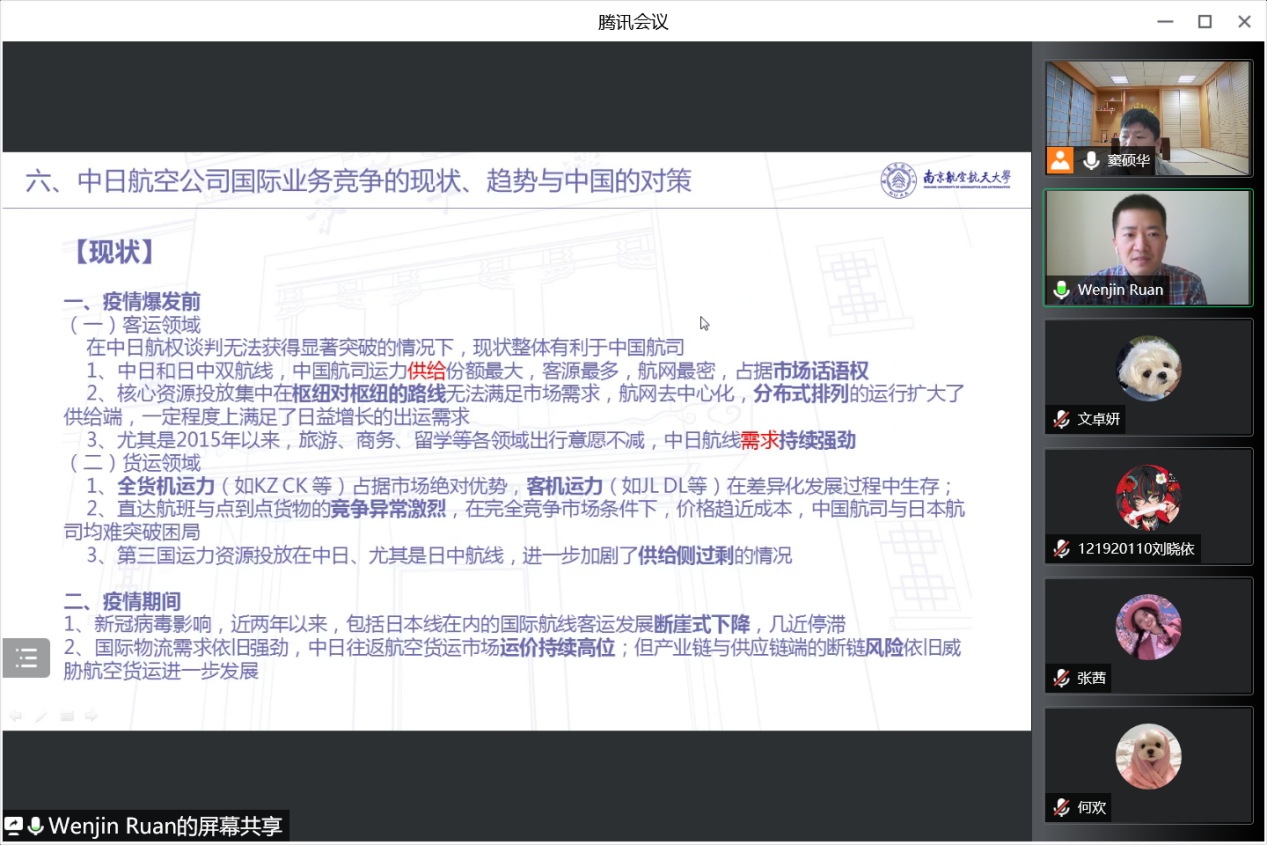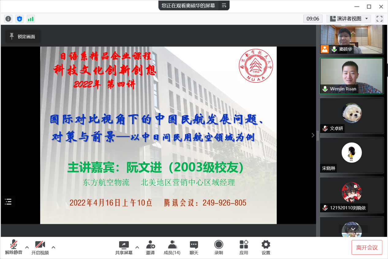 4月16日上午10点,365上市公司日语系精品企业课程《科技文化创新创想》2022年度第四讲通过腾讯会议成功进行,本次主题为《国际对比视角下的中国民航发展问题、对策与前景——以中日间民用航空领域为例》。主讲嘉宾为03级日语系校友、现就职于东方航空物流北美地区营销中心的阮文进经理。