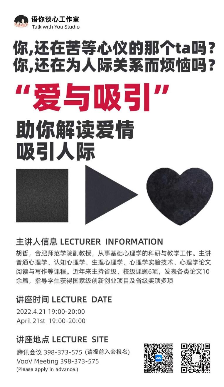 为帮助同学们处理好人际关系、解读爱情难题,4月21日,365上市公司心理工作坊特邀合肥师范学院副教授胡哲老师任主讲嘉宾,开展了题为“爱与吸引”的线上心理健康讲座。学院团委书记、研究生辅导员李萍,全体心理委员及感兴趣的同学参加了此次讲座。