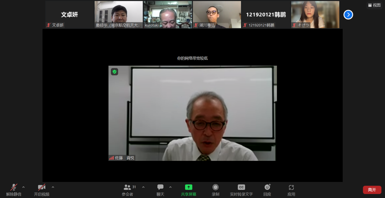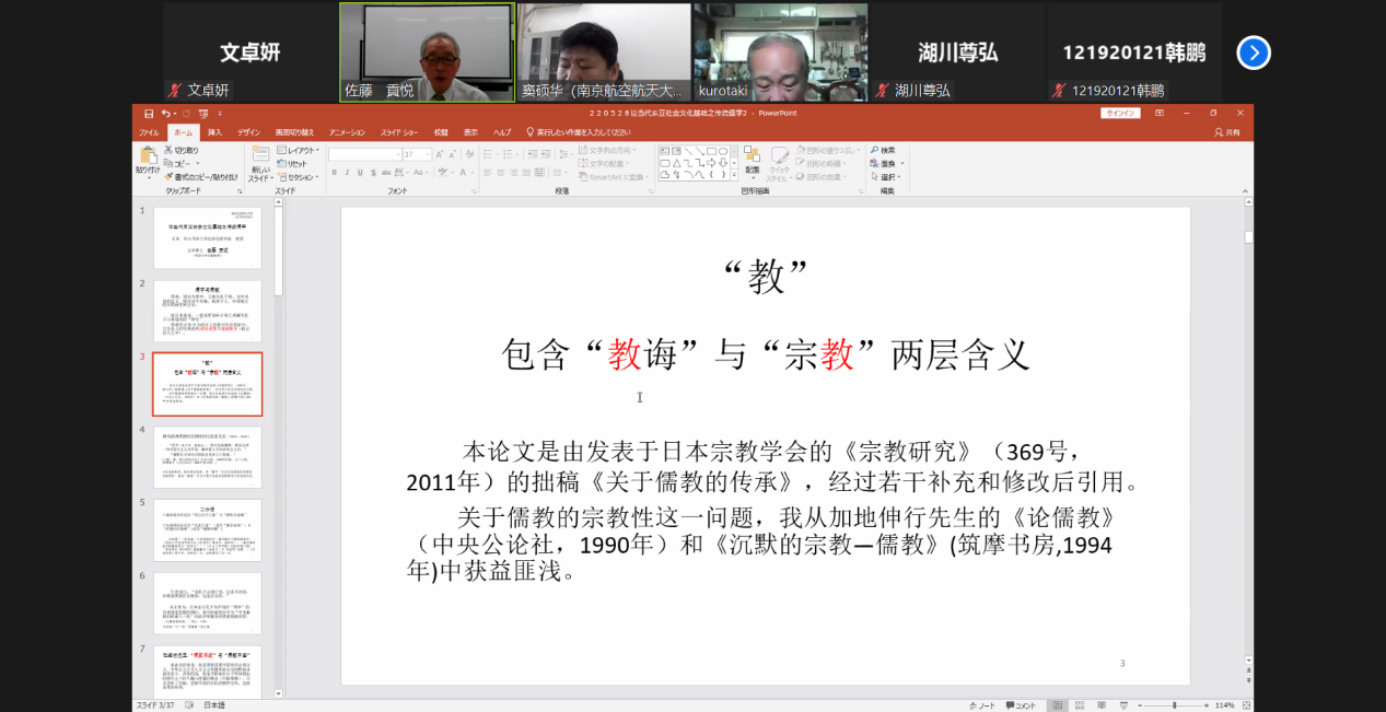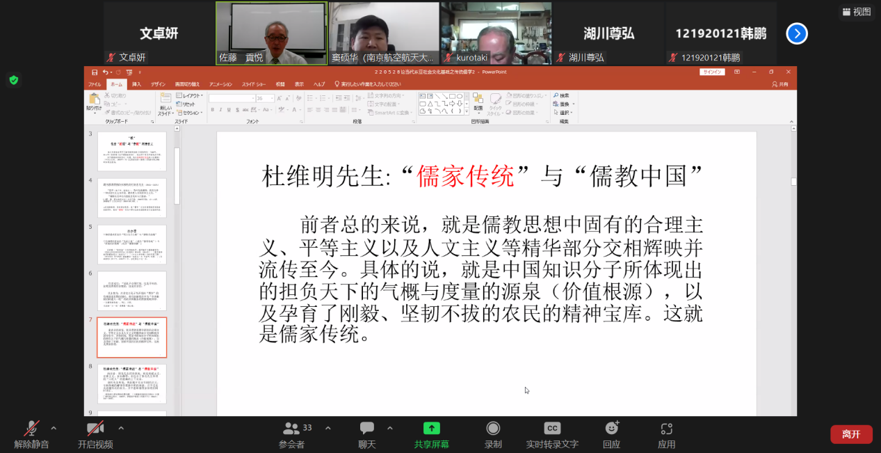 5月28日(周六)上午9:00,365上市公司日语系海外名师讲坛第一讲通过线上ZOOM会议成功进行,主题为《現代東アジア社会の文化的基礎としての伝統儒学》。主讲嘉宾为环太平洋大学教授・筑波大学名誉教授佐藤贡悦。讲座由日语系主任窦硕华老师主持,外专项目领衔人・东京农业大学黒瀧秀久教授和南航日语系40余名同学参加了讲座。