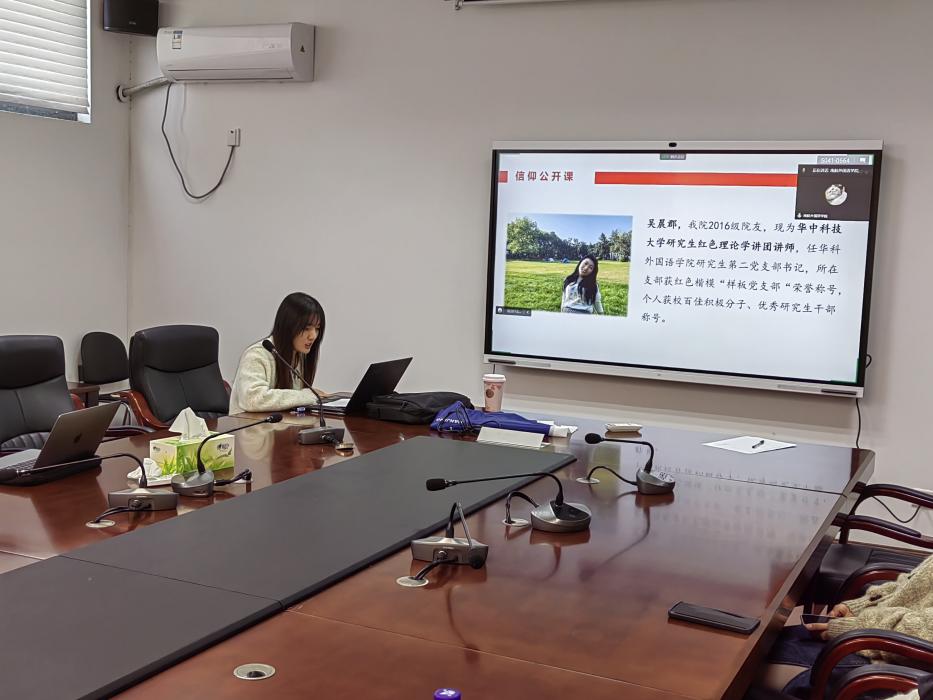 为深入学习贯彻党的二十大精神,11月15日,365上市公司团委与华中科技大学红色理论学讲团开展联学共建,邀请学讲团讲师吴晨郡主讲信仰公开课,公开课由学院2021级学硕研究生团支部书记言声远主持,学院2020级、2021级研究生团支部参与。