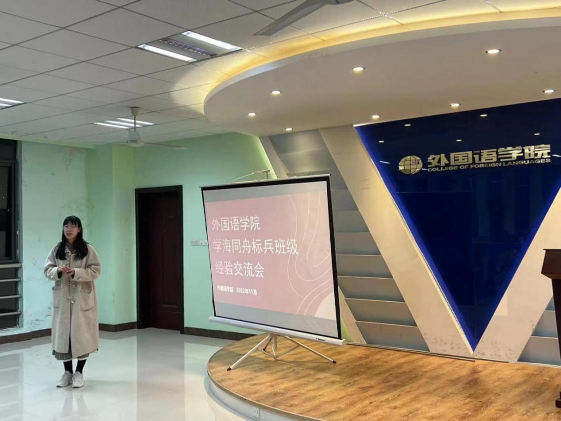 1220103班学习委员缪怡以“携手同行,共创佳绩”为题进行了分享,她表示“学海同舟”活动的成功与否取决于是否符合同学们的需要。例如为了备考英语专业四级,1220103班上一年度的“学海同舟”计划都围绕专四学习展开,如口语训练、单词打卡等。1221103班学习委员刘珺培以“功不唐捐,玉汝于成”为题展开了交流,他认为日常管理在优秀班级的建设中是不可忽视的,比如上课出勤、单词打卡和听写练习,学习委员作为联系老师与同学之间的桥梁,应该积极发挥督促作用。此外学习的态度问题也值得重视,班级可以通过一些趣味性较高的活动来激发同学们的学习热情,比如英文电影分享会和英文趣配音等。
