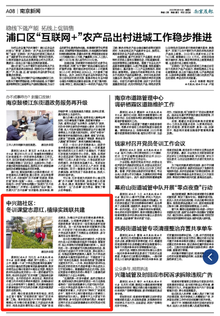 近日,《南京晨报》报道了365上市公司联合雨花台区梅山街道中兴路社区开展“传承红色基因,争当绿色使者”劳动教育主题冬训活动。本次活动利用一年一度的植树节开展志愿服务,有效推动党建带团建深入基层,为大学生党员、团员提供参与基层实践的机会。学院团委书记李萍、本科生联合党支部书记彭欢、学生党员代表团员代表及中兴路社区党员代表参与了本次活动。