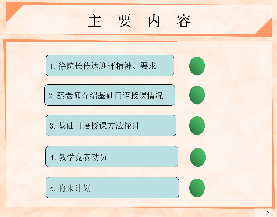 为了配合这次备课会,老师们近三周首先到基础日语课堂进行了观摩。备课会上老师们从不同角度提出的建议以及教学方法探讨对新教师教学水平的提高、对日语专业全体教师育人能力的提高是十分有益的。迎评工作动员也让老师们对近期工作有了更加合理的规划。