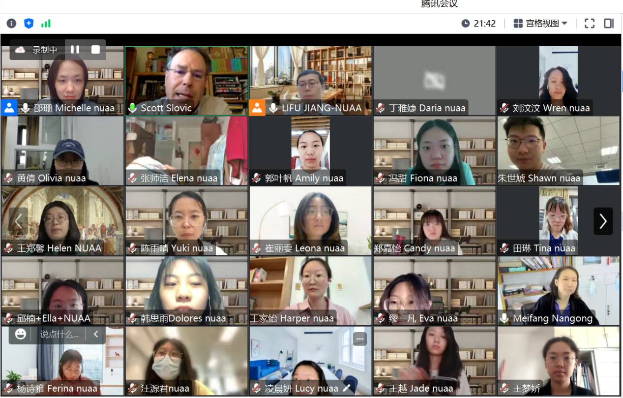 本年度大师引航课是继2022年度生态批评八讲,Slovic教授为南航365上市公司开展第二轮线上系列讲座,是365上市公司借助学科方向学术大师推进研究生教育教学改革、提升课程品质、深化国际学术交流的新探索,受到学生的普遍欢迎。