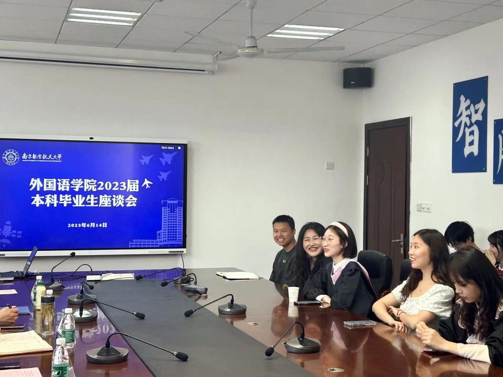 参会教师对2023届毕业生致以毕业寄语,祝福同学们顺利毕业。范祥涛表达了对2023届毕业生的祝福,肯定了同学们在本科期间取得的优异成绩。并寄语毕业班同学,无论毕业后是继续求学还是走上工作岗位,作为语言学习者都不能忘记读书,读书可以使思想更有深度,对于人生的判断抉择都大有裨益。徐以中寄语2023届毕业生“种下善意的种子,收获美好的前程”,心怀大爱大善,发现并享受生命中的美好。张立新对毕业生殷切寄语,“今天你们以南航为荣,明天南航以你们为荣”。窦硕华对本届毕业生取得的优异成绩予以高度肯定,希望同学们在未来的学习和工作中再创辉煌。巫和雄希望同学们在今后的学习工作中能够正确面对人生的顺境与困境,脚踏实地,仰望星空。老师们希望毕业生在未来的学习和工作能,能够将自身发展同国家的前途命运相结合,努力实现个人价值。
