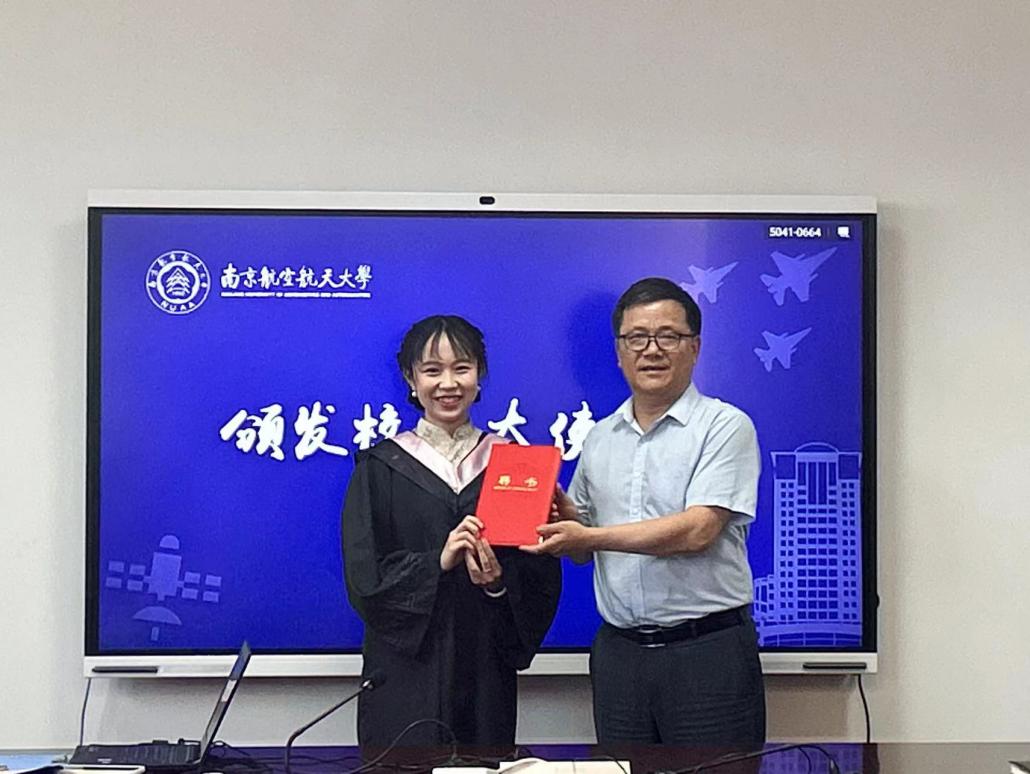 范祥涛向校友大使朱芷苑颁发聘书,希望2023届毕业生不忘学院背景,将南航外院当做永远的家园,欢迎毕业生们随时“回家看看”。