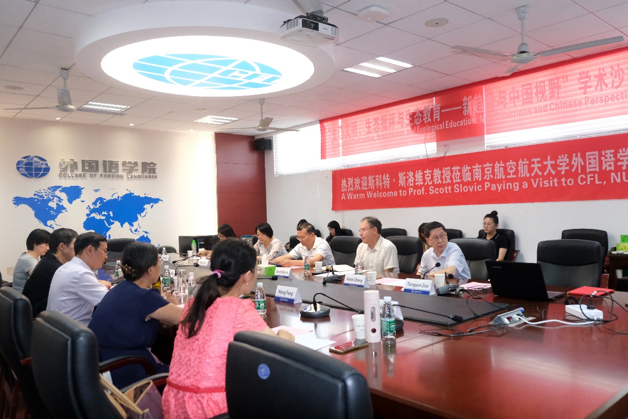 学术沙龙主要分为三个环节。第一阶段对生态文明、生态批评和生态教育的关系,尤其生态批评发展的新趋势开展研讨。斯洛维克教授作重点发言,对物质生态批评、实证生态批评、气候小说批评、情感生态批评、医学-环境人文、植物生态批评、中医生态批评等生态批评新趋势进行梳理和介绍,然后开展研讨。第二阶段对南航校规划教材《21世纪生态批评与环境人文新趋势》开展讨论。由姜礼福介绍教材编写大纲和设计思路,程爱民教授、何成洲教授、方红教授、石海毓教授、韦清琦教授依次发言,提出相关建议。第三阶段,对生态研究的未来及其跨学研究开展研讨。何成洲教授结合生态批评的跨媒介研究进行重点发言。