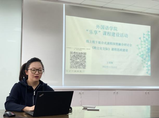 王珺琳老师分享了在《跨文化交际》课程思政建设方面的探索和思考:如何理解“课程思政”的内涵,如何在课程建设中挖掘思政元素并将其与教学实践有机融合,以实现对学生进行思想引领、价值观塑造等方面的积极作用。王珺琳还和老师们共同探讨了课程思政实施过程中的一些思考,例如“课程思政如何在全方位育人过程中实现?”“课程思政能否通过考核来测试或评价?”