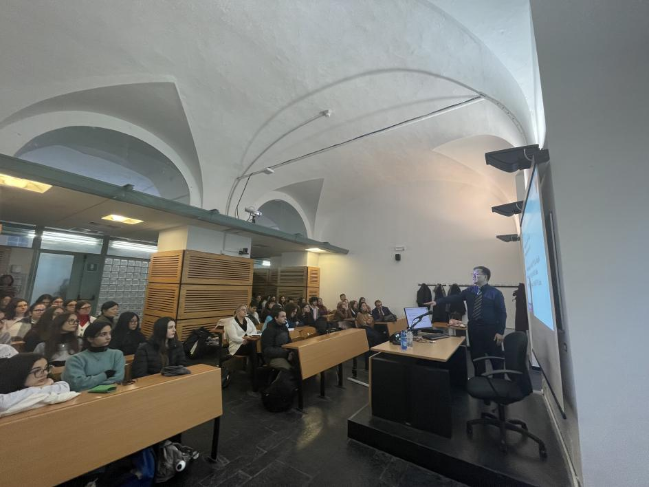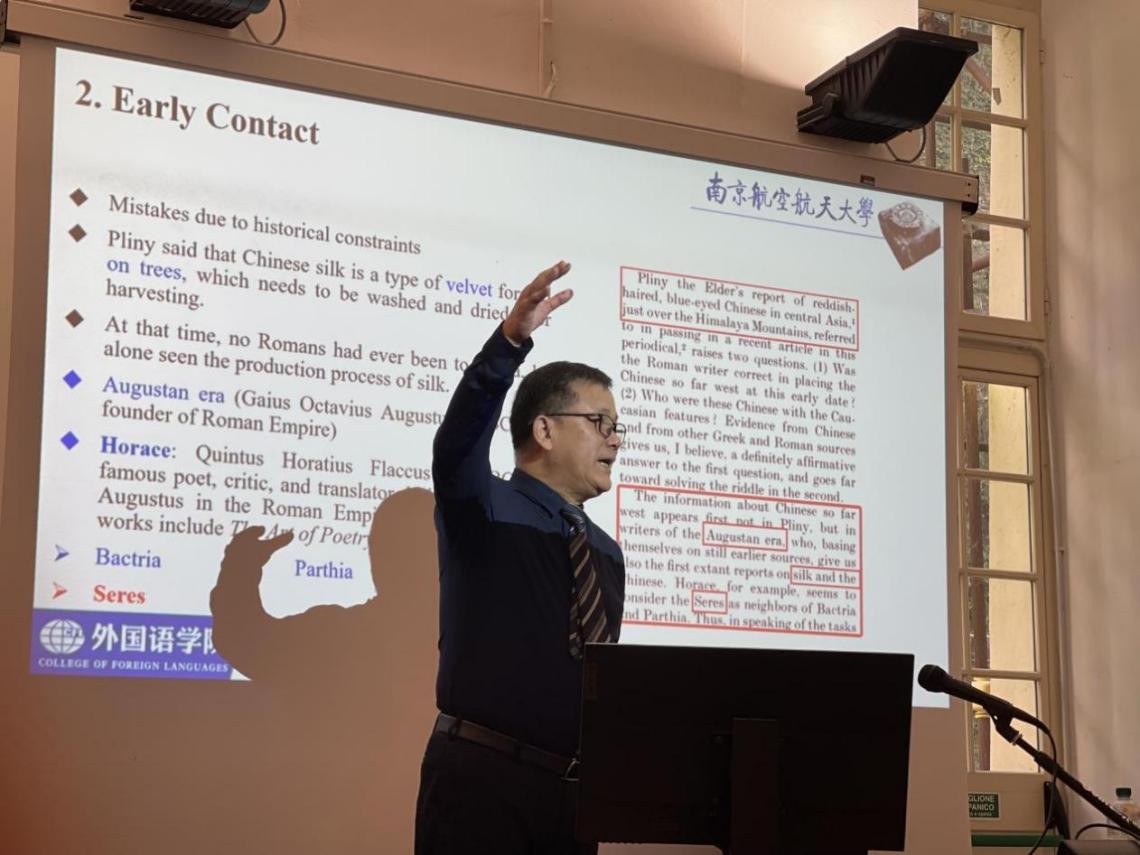 12月5日中午,应热那亚大学的邀请,范祥涛教授给热那亚大学的师生们做了一场题为《中意文化交流》的精彩讲座。讲座追溯了中意学术交流源远流长的历史,概述了当代意大利汉学家的研究现状。范教授在讲座中穿插了中国的书法、汉字和诗歌的相关知识,旁征博引,与学生们展开了热烈的互动。讲座调动了学生们学习汉语的热情,学生们纷纷表达了来我校学习的热切愿望。此外,范教授还与中文系教授就中国著作翻译出版进行了商谈,双方达成一致意见,同意未来开展著作的汉意、意汉翻译出版,促进双方的文化交流。
