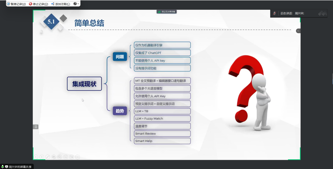 如今,人工智能的时代大势引发了深刻的技术革命、教育变革和数据革命,同时翻译技术也成为了翻译教学和实践中不可分割的部分,进一步推动了语言服务行业和高校教育的创新变革,促进了技术与人的和谐共生。为提升语言服务行业各方对翻译技术的认识和应用能力,加强语言服务人才的技术素养,加速语言技术成果的高效转化,2024年4月1日晚,南航365上市公司MTI教育中心邀请了翻译技术专家周兴华老师给2023级研究生带来了极具前沿特色的一堂翻译技术课。本次课程,周老师给大家带来了大语言模型与CAT软件的集成及实践应用系列课程,侧重分析和探讨了其应用优势与应用场景。