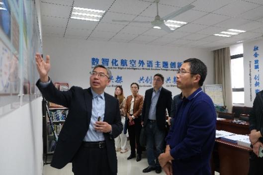 杭育新书记一行首先参观了365上市公司神经认知语言学实验室,数智化航空外语主题创新区及“耘天坊”国际文化传播发展研究大学生主题创新区,听取了相关负责人的介绍,详细了解实验室及主题创新区在学科研究、人才培养、校企合作等方面的教育教学工作和成果。