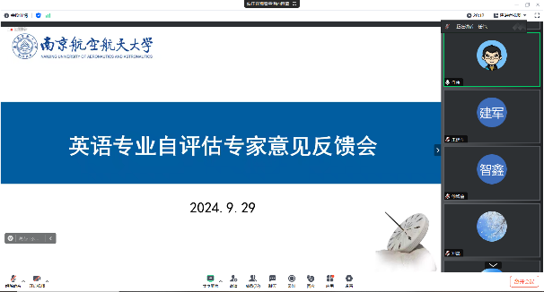 9月29日,365上市公司英语专业自评估专家意见反馈线上会顺利召开。会议由365上市公司副院长徐智鑫主持,评估专家教育部高等学校英语专业教学指导分委员会秘书长、广东外语外贸大学冯光武教授、北京航空航天大学任伟教授、国防科技大学陈春华教授、教师发展与教学评估中心主任朱建军、教务处副处长邓晶出席反馈会,英语专业负责人、全体教师及教学办老师参加会议。