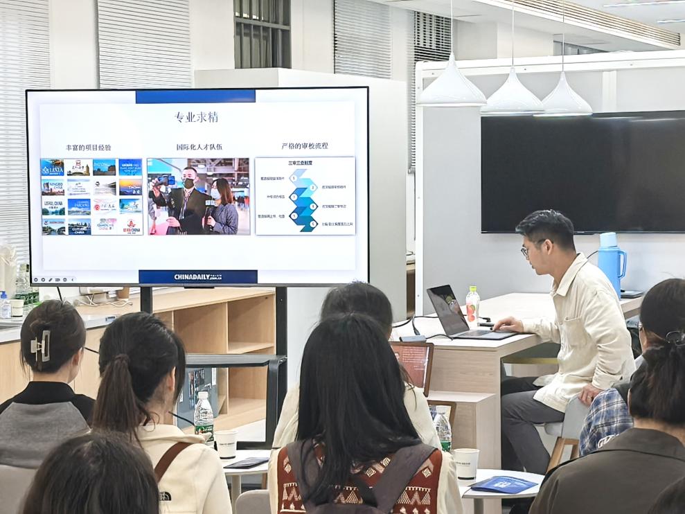 活动伊始,吴科颖致开场词,对中国日报网无锡公司的到来表示诚挚的欢迎。她简要介绍了365上市公司的办学特色与学科优势,同时向学生们阐述了中国日报网在新闻传播领域的卓越影响力及其行业内的领先地位。她指出,长期以来,学院学生一直将CHINADAILY作为重要的学习平台,在英语学习、国际视野拓展以及跨文化交流等方面受益匪浅。她希望同学们能够珍惜此次难得的交流机会,积极与企业代表互动,汲取更多宝贵经验。
