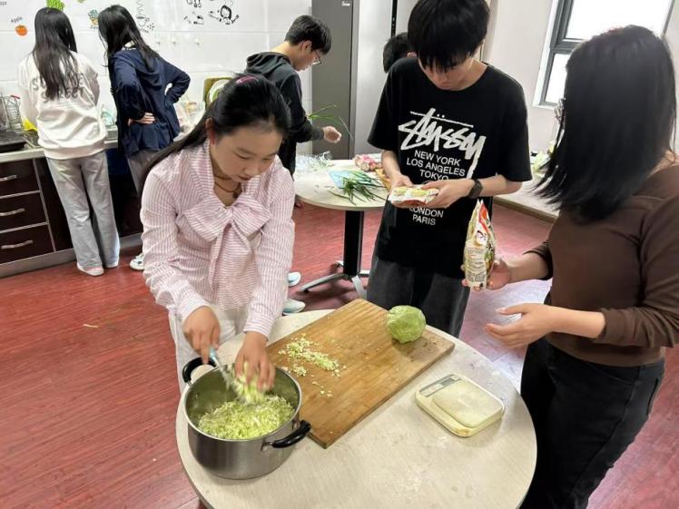 中午时分,外教北村忠吉老师在“快乐厨房”带领同学们制作了日本传统美食大阪烧与甜点松饼。在过程中,他耐心地讲解制作步骤,不时用幽默的语言调动气氛,同学们一边认真聆听,一边协助北村制作美食。