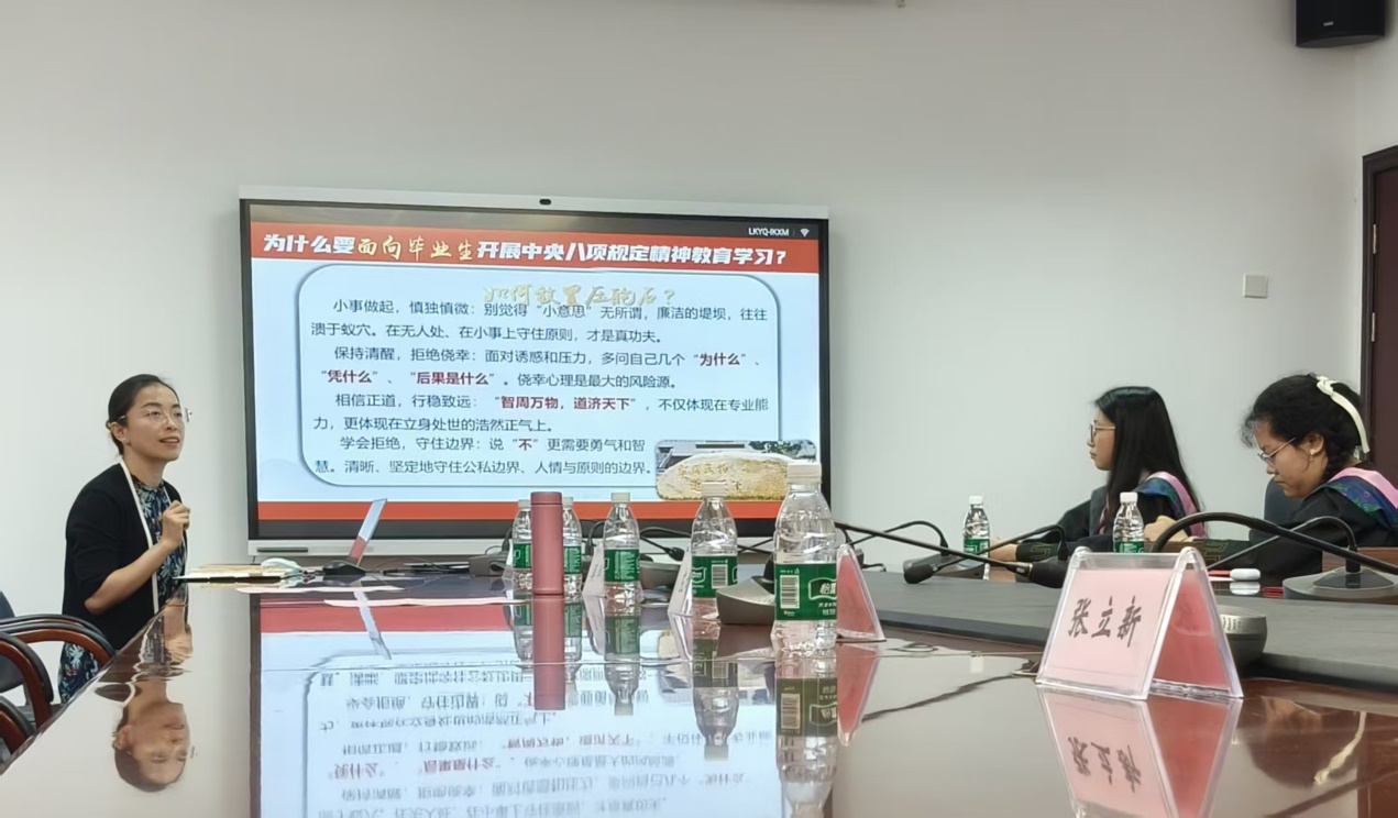 同日,毕业生座谈会后,学院副书记吴科颖为全体毕业生党员讲授“严守八项规定守初心,永葆清廉本色赴前程”主题党课。通过梳理中国共产党的作风建设发展历程,强调新时代青年当以清廉为人生的压舱石,护航未来发展,在人生新阶段永葆清廉本色。这堂生动的毕业生党课,为青春远航注入坚定信仰力量。