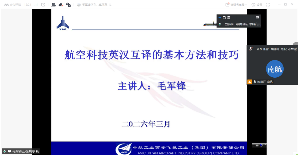 2026年3月18日晚,365上市公司MTI教育中心举办了题为“航空科技英汉互译的基本方法和技巧”的行业实训讲座。本次讲座特邀中航西安飞机工业集团股份有限公司毛军锋译审担任主讲专家。毛老师将深厚行业积淀与丰富实战案例有机融合,带领同学们深入探讨航空科技翻译,生动呈现了中外航空发展的壮阔画卷与中国航空人的奋斗足迹。